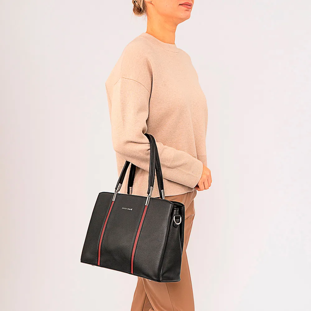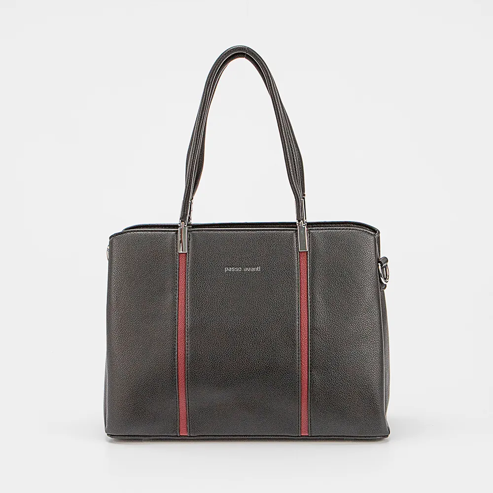 Сумка от торговой марки Passo Avanti из искусственной кожи черного цвета. Лицевая сторона декорирована вставками бордового цвета. Модель с двумя удлиненными ручками, съемным регулируемым плечевым ремнем. Закрывается молнией. Внутри: три отделения, с текстильной подкладкой; в среднем – карман на молнии, два накладных кармана. На задней стороне – карман на молнии. Дно оснащено металлическими ножками для защиты от износа.