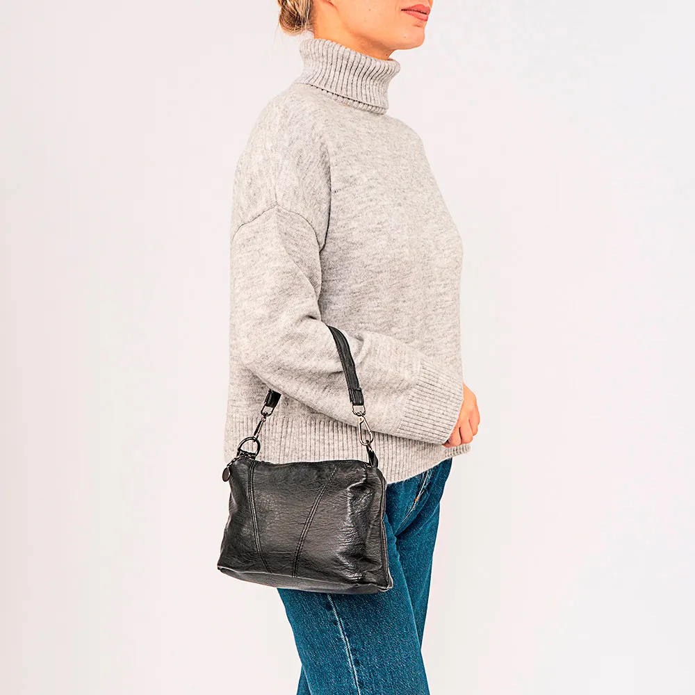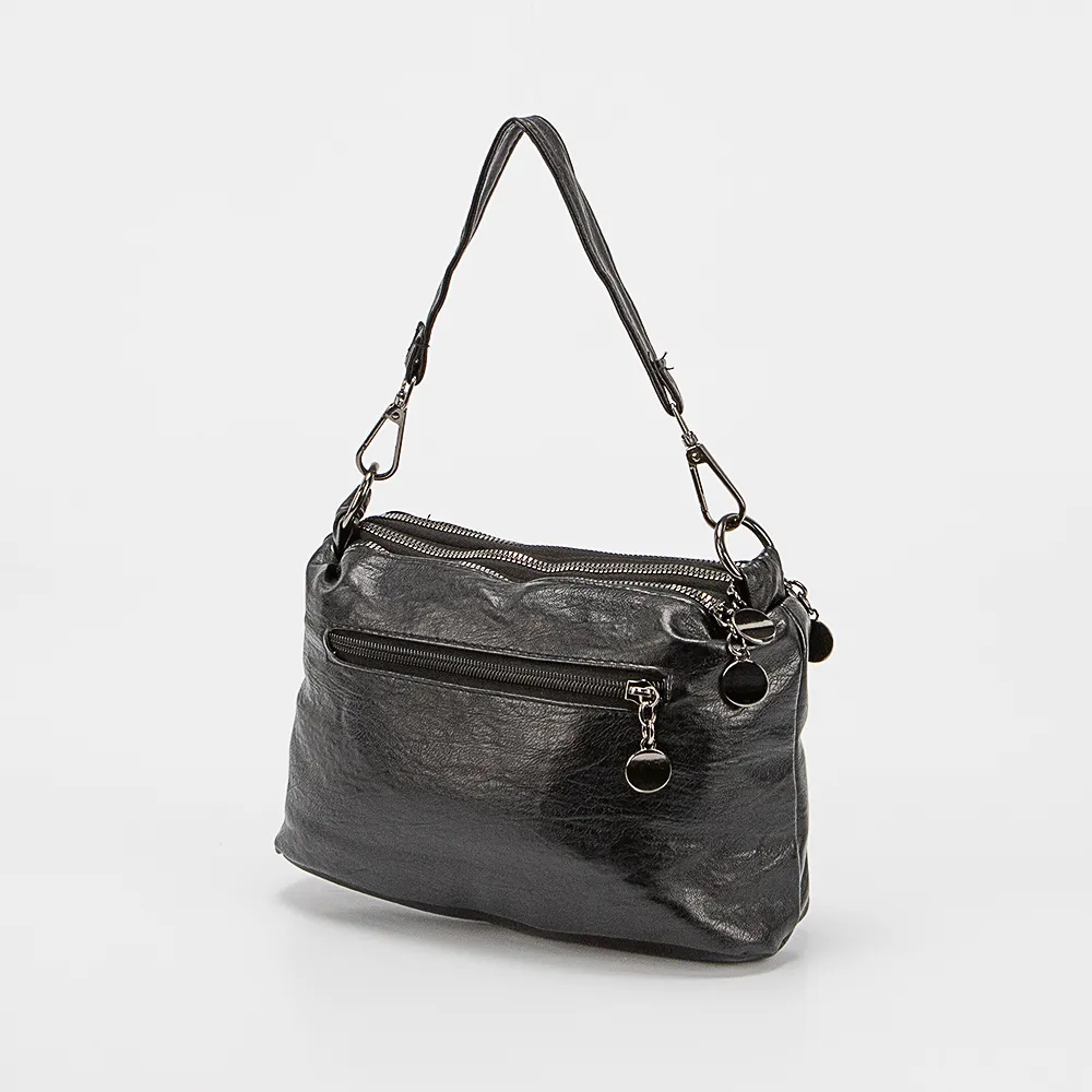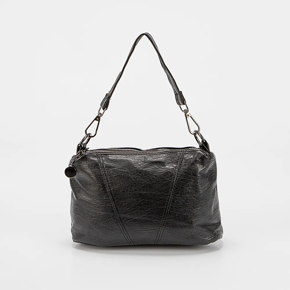 Сумка от торговой марки Passo Avanti из искусственной кожи черного цвета. Модель со съемной ручкой и съемным регулируемым плечевым ремнем. Три отделения на молнии, с текстильной подкладкой; в среднем отделении – карман на молнии. На задней стороне – карман на молнии.