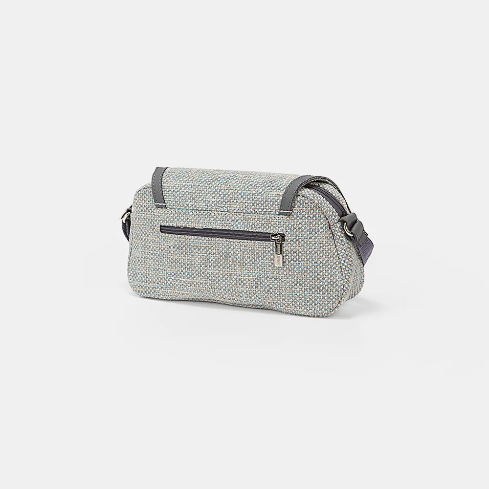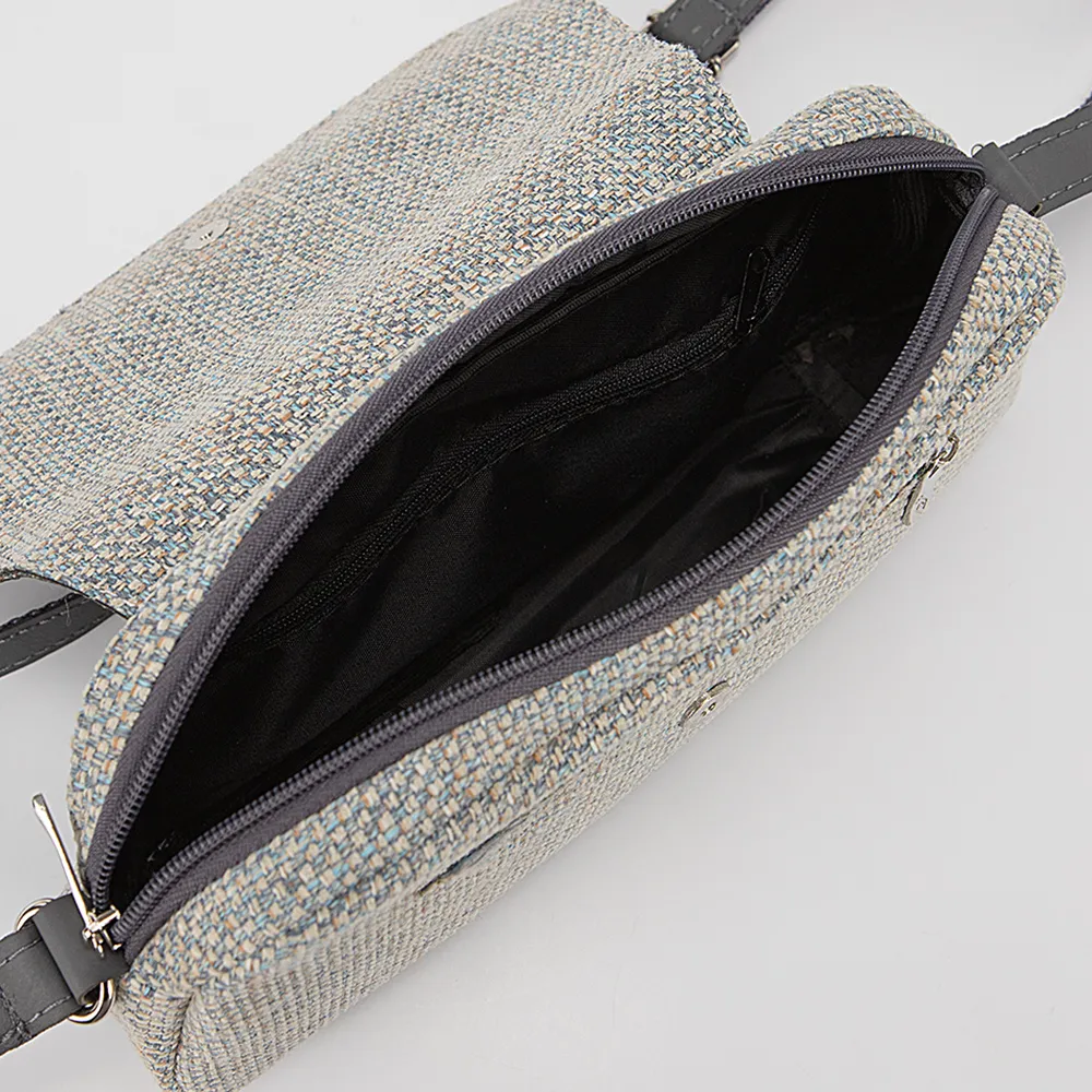 Сумка от торговой марки Passo Avanti из текстильного материала и искусственной кожи голубого цвета. Модель со съемным регулируемым плечевым ремнем. Клапан на магнитной кнопке закрывает карман на молнии и отделение на молнии. Внутри: текстильная подкладка, карман на молнии. На задней стороне – карман на молнии.
