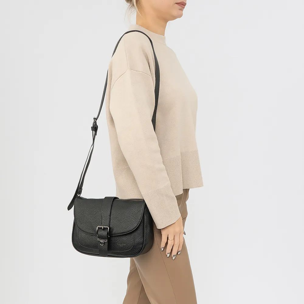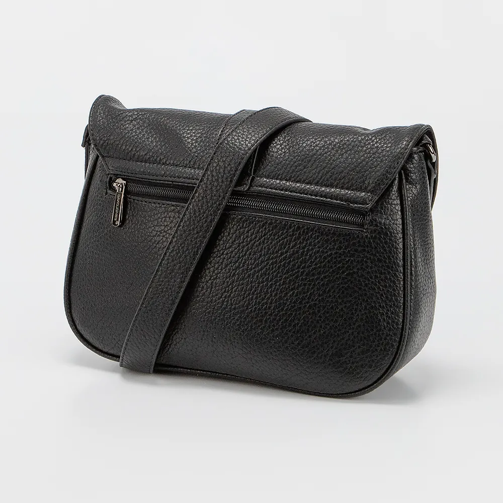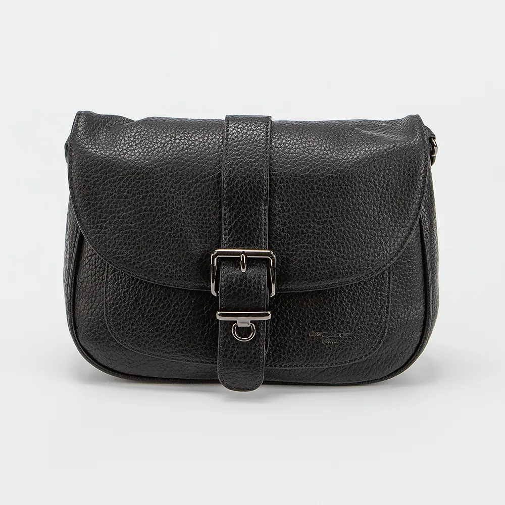 Сумка от торговой марки David Jones из искусственной кожи черного цвета. Модель с несъемным регулируемым плечевым ремнем. Клапан на магнитной кнопке закрывает накладной карман и отделение на молнии. Внутри: фирменная подкладка, карман на молнии и накладной карман. На задней стороне – карман на молнии.