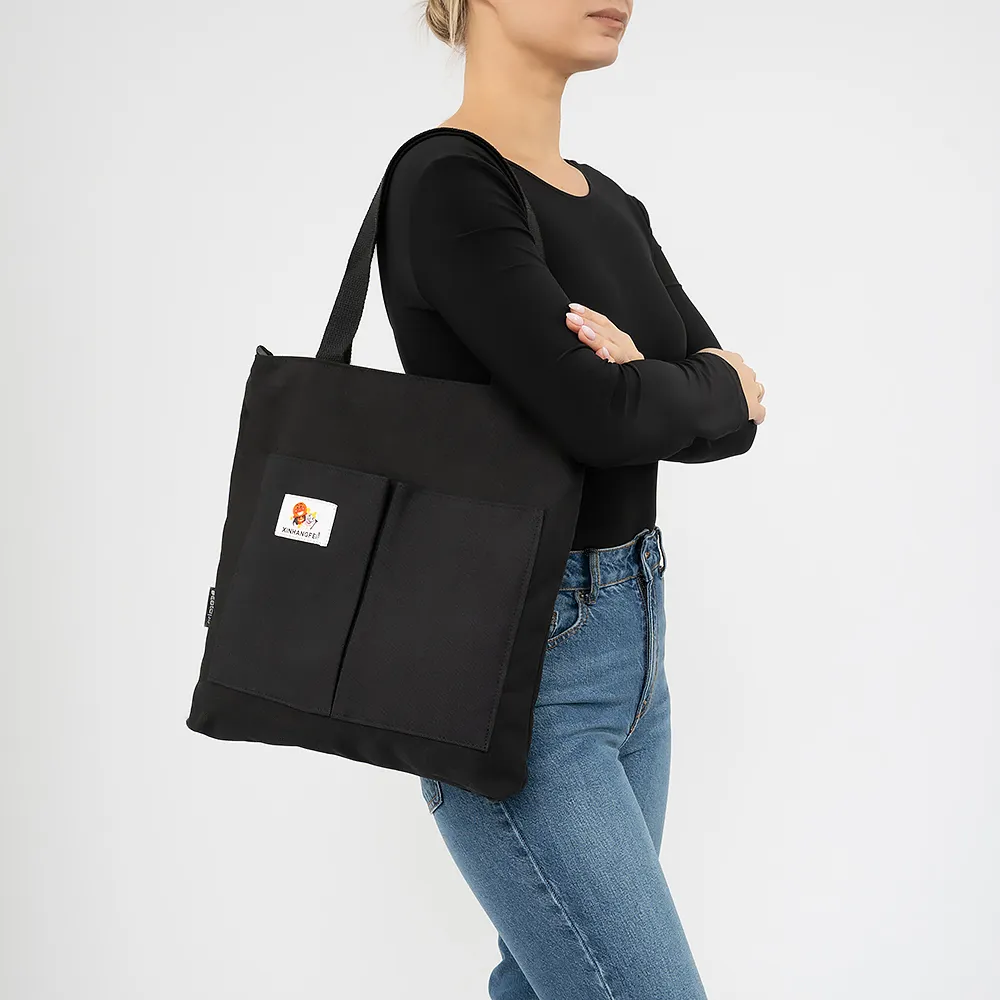 Сумка-шоппер от торговой марки Ecotope из плотного практичного текстильного материала черного цвета. Модель с двумя удлиненными ручками и съемным регулируемым плечевым ремнем. Отделение на молнии. Внутри: накладной карман. На лицевой стороне – два накладных кармана без застежки.