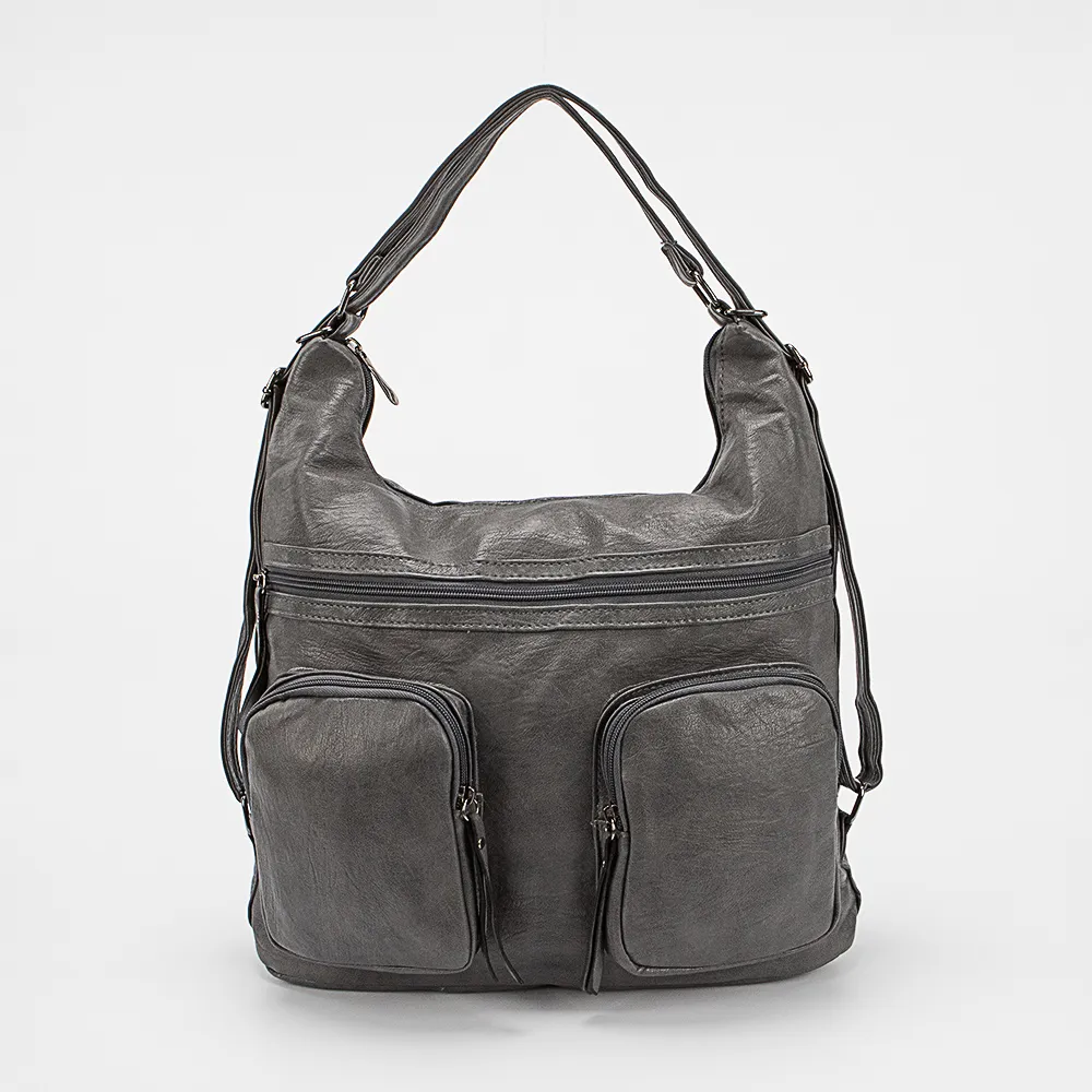 Сумка-рюкзак от торговой марки Passo Avanti из искусственной кожи серого цвета. Модель с двумя ручками, которые стягиваются в плечевые лямки. Отделение на молнии. Внутри: текстильная подкладка, средник и кармана на молнии, два накладных кармана. На лицевой стороне – три кармана на молнии. На задней стороне – карман на молнии.