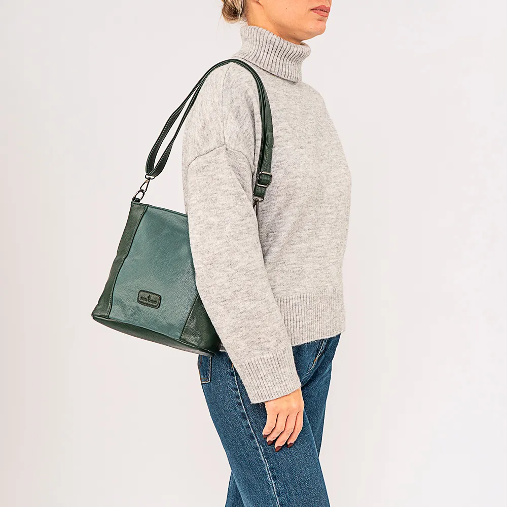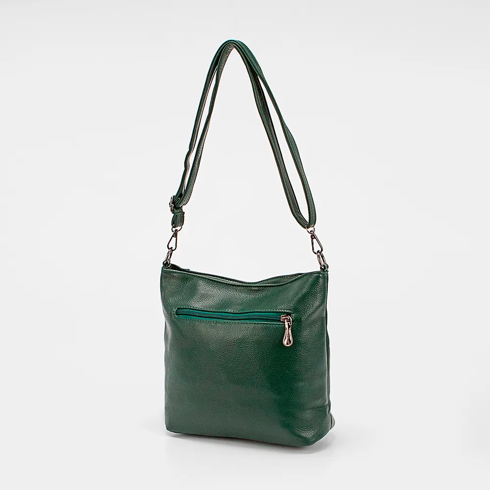 Сумка от торговой марки Passo Avanti из искусственной кожи в сочетании оттенков зеленого цвета. Модель со съемным регулируемым плечевым ремнем. Отделение на молнии. Внутри: текстильная подкладка, карман на молнии, два накладных кармана. На задней стороне – карман на молнии.