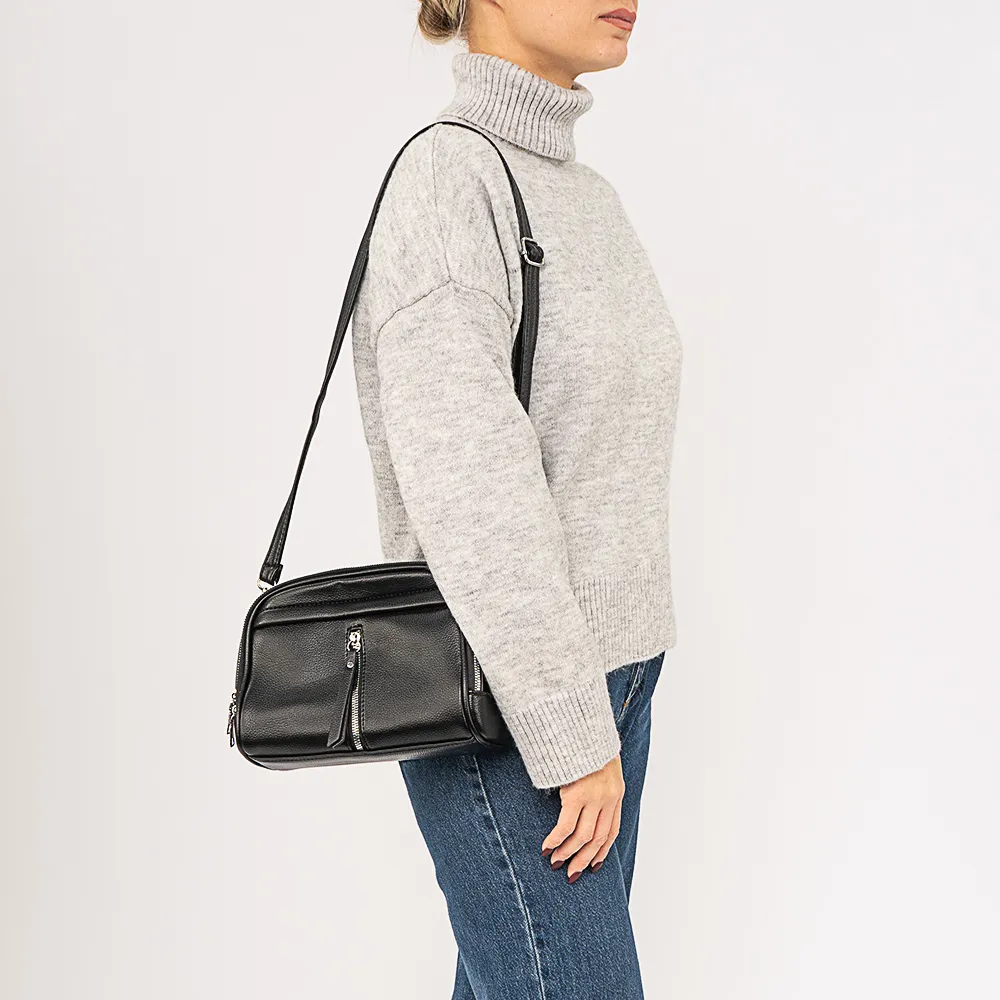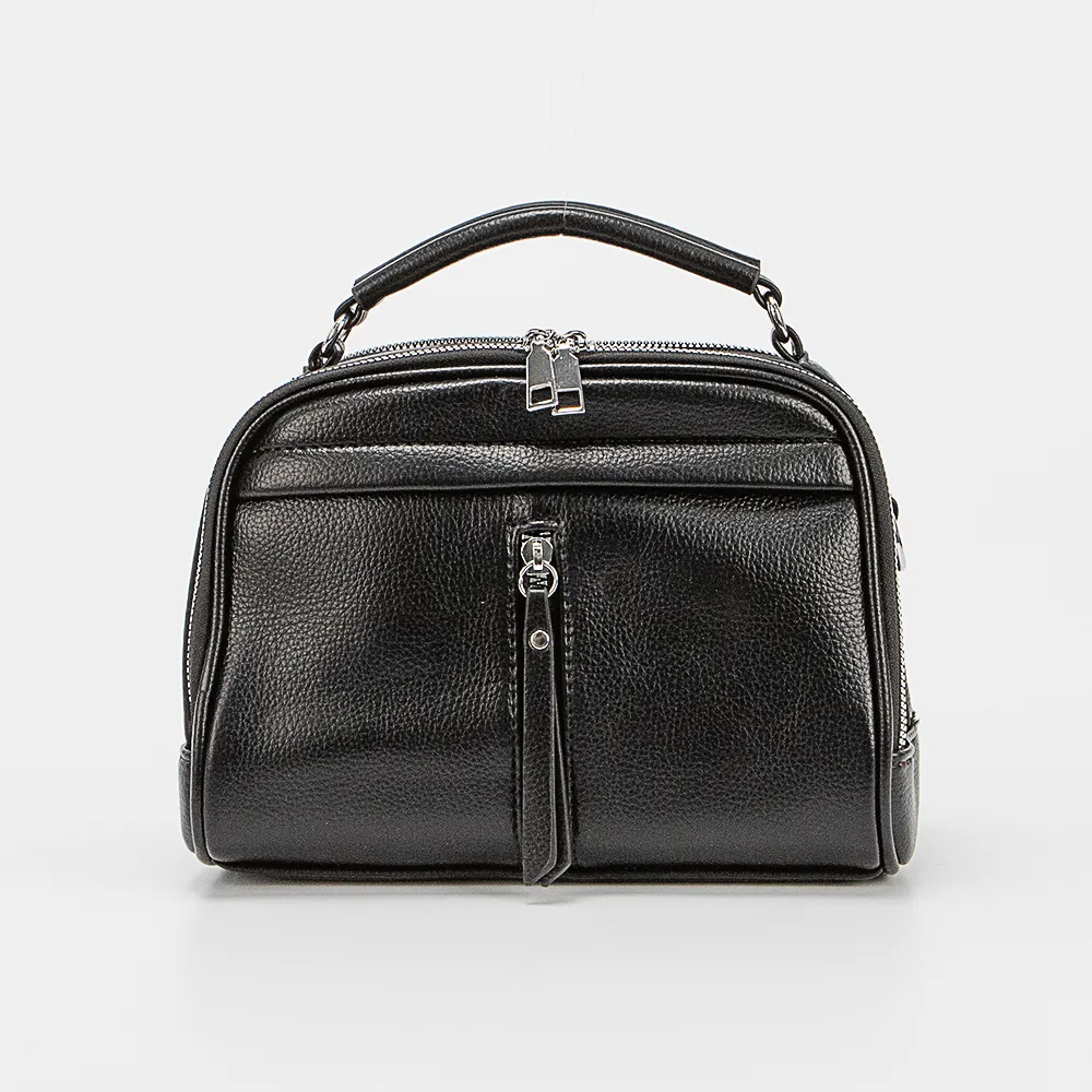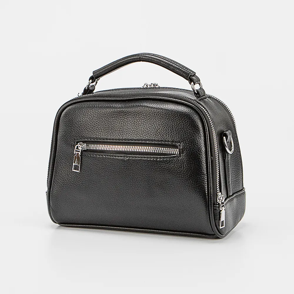 Сумка от торговой марки Passo Avanti из искусственной кожи черного цвета. Модель с одной ручкой и съемным регулируемым плечевым ремнем. Отделение закрывается двумя молниями. Внутри: текстильная подкладка, средник и карман на молнии, накладной карман. На лицевой и задней сторонах – карман на молнии.