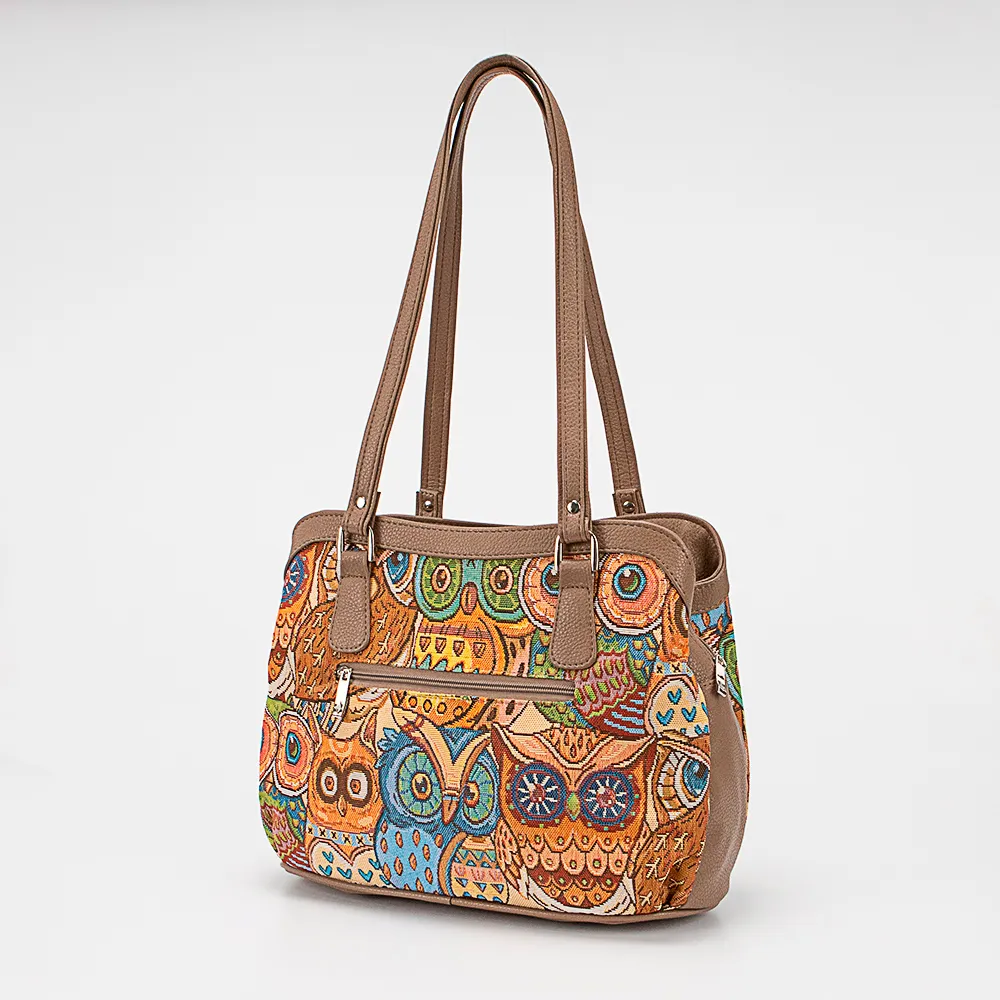Сумка от торговой марки Passo Avanti из искусственной кожи и гобеленовой ткани и оригинальным рисунком с изображением сов. Модель с двумя удлиненными ручками. Три отделения на молнии. Внутри: текстильная подкладка; в среднем отделении – карман на молнии. На задней стороне – карман на молнии.