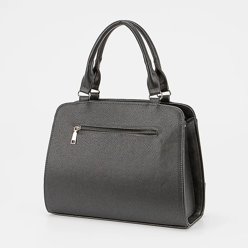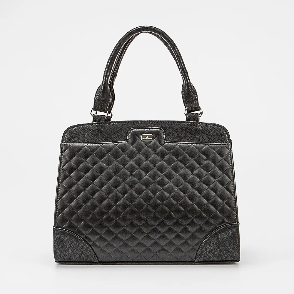 Сумка от торговой марки Passo Avanti из искусственной кожи черного цвета. Декорирована ромбовидной стежкой. Модель с двумя ручками на кольцах и съемным плечевым ремнем. Отделение на молнии. Внутри: текстильная подкладка, средник и карман на молнии. На задней стороне – карман на молнии.