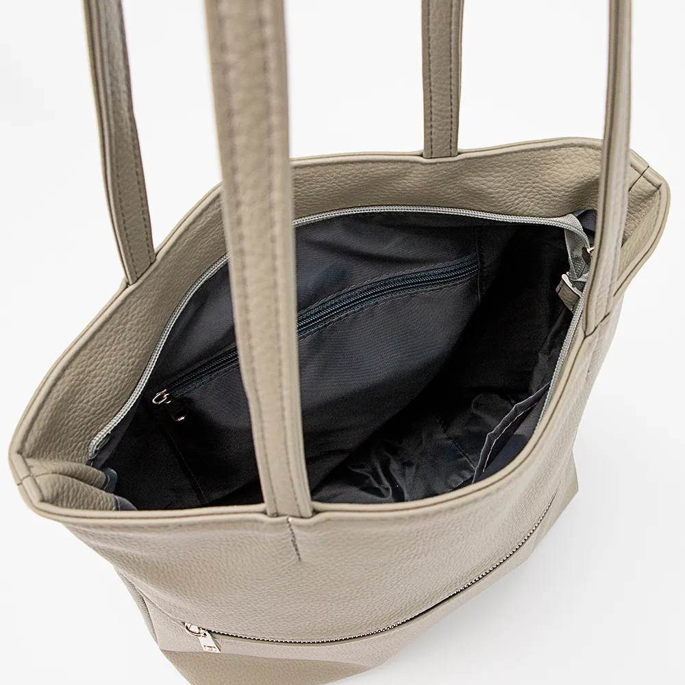Сумка от торговой марки Passo Avanti из искусственной кожи серого цвета. Модель вертикальной ориентации, с двумя удлиненными тонкими ручками. Глубокое отделение на молнии. Внутри: текстильная подкладка, карман на молнии, два накладных кармана. На задней стороне – карман на молнии.