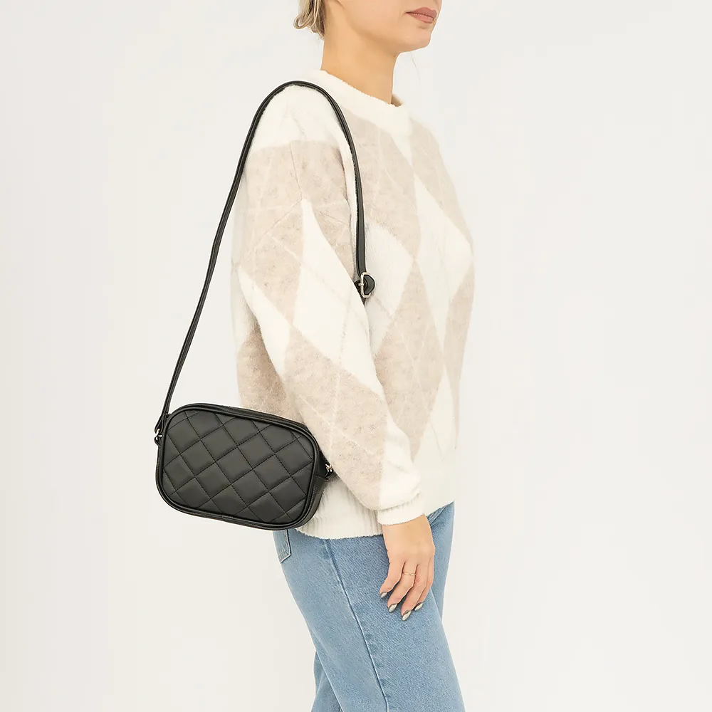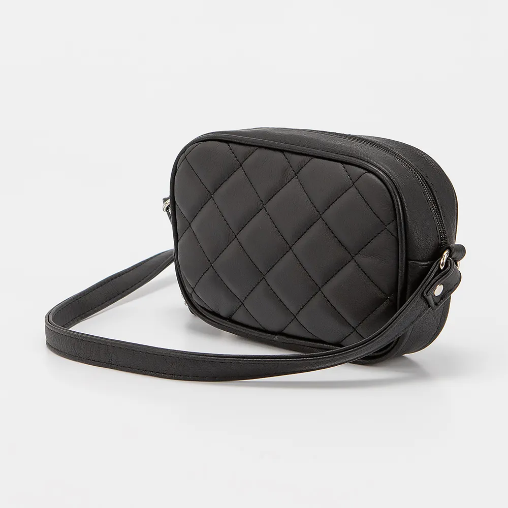 Сумка от торговой марки Passo Avanti из искусственной кожи черного цвета. Декорирована ромбовидной стежкой. Модель овальной формы с несъемным регулируемым плечевым ремнем. Отделение на молнии. Внутри: текстильная подкладка, карман на молнии, накладной карман. На задней стороне – карман на молнии.