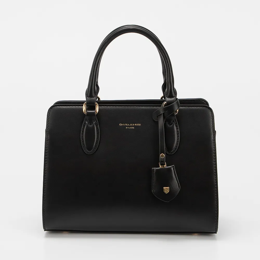 Сумка от торговой марки David Jones из искусственной кожи черного цвета. Декорирована подвеской из искусственной кожи. Модель с двумя ручками и съемным регулируемым плечевым ремнем. Отделение на молнии. Внутри: фирменная подкладка, карман на молнии, накладной карман. Спереди и сзади карманы на магнитной кнопке. Дно оснащено металлическими ножками для защиты от износа.
