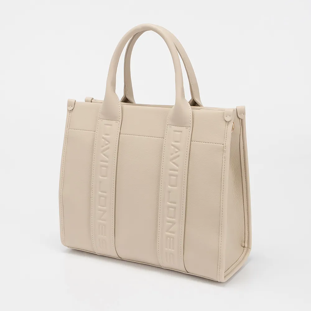Сумка от торговой марки David Jones из искусственной кожи светло-бежевого цвета. Модель с двумя ручками и съемным регулируемым плечевым ремнем. Отделение на молнии. Внутри: фирменная подкладка, карман на молнии, накладной карман. Дно оснащено металлическими ножками для защиты от износа.