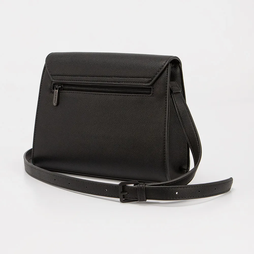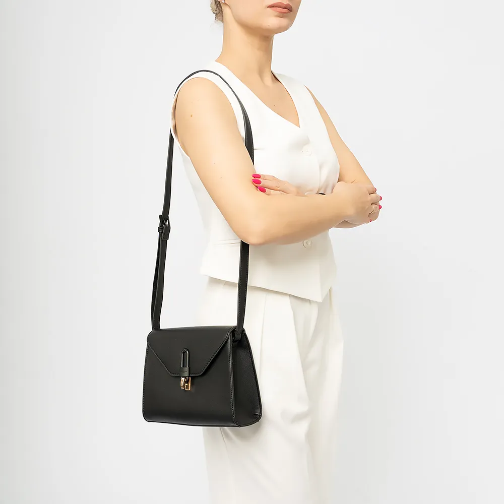 Сумка от торговой марки David Jones из искусственной кожи черного цвета. Компактная модель с длинным регулируемым плечевым ремнем. Отделение закрывается клапаном на поворотном замке. Внутри: фирменная подкладка, накладной карман, карман на молнии.
