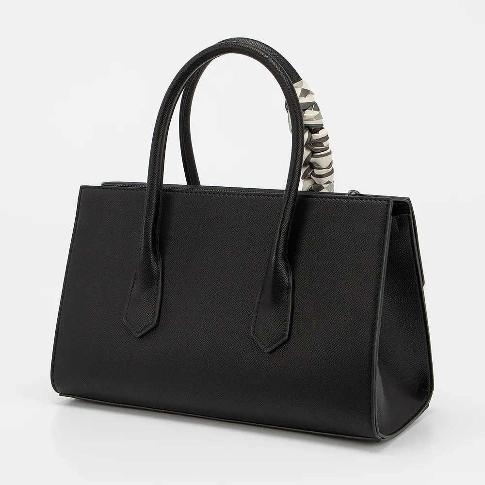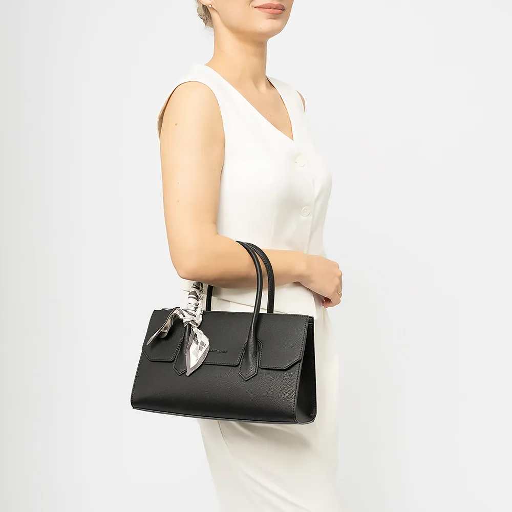 Сумка от торговой марки David Jones из искусственной кожи черного цвета. Модель с двумя ручками и съемным регулируемым плечевым ремнем. Декорирована платком твилли. Отделение на молнии. Внутри: фирменная подкладка, накладной карман, карман на молнии.