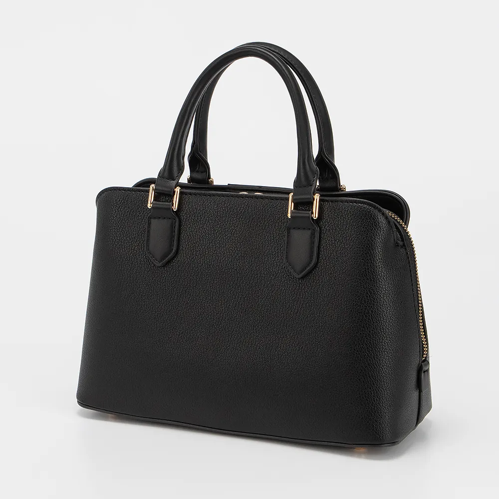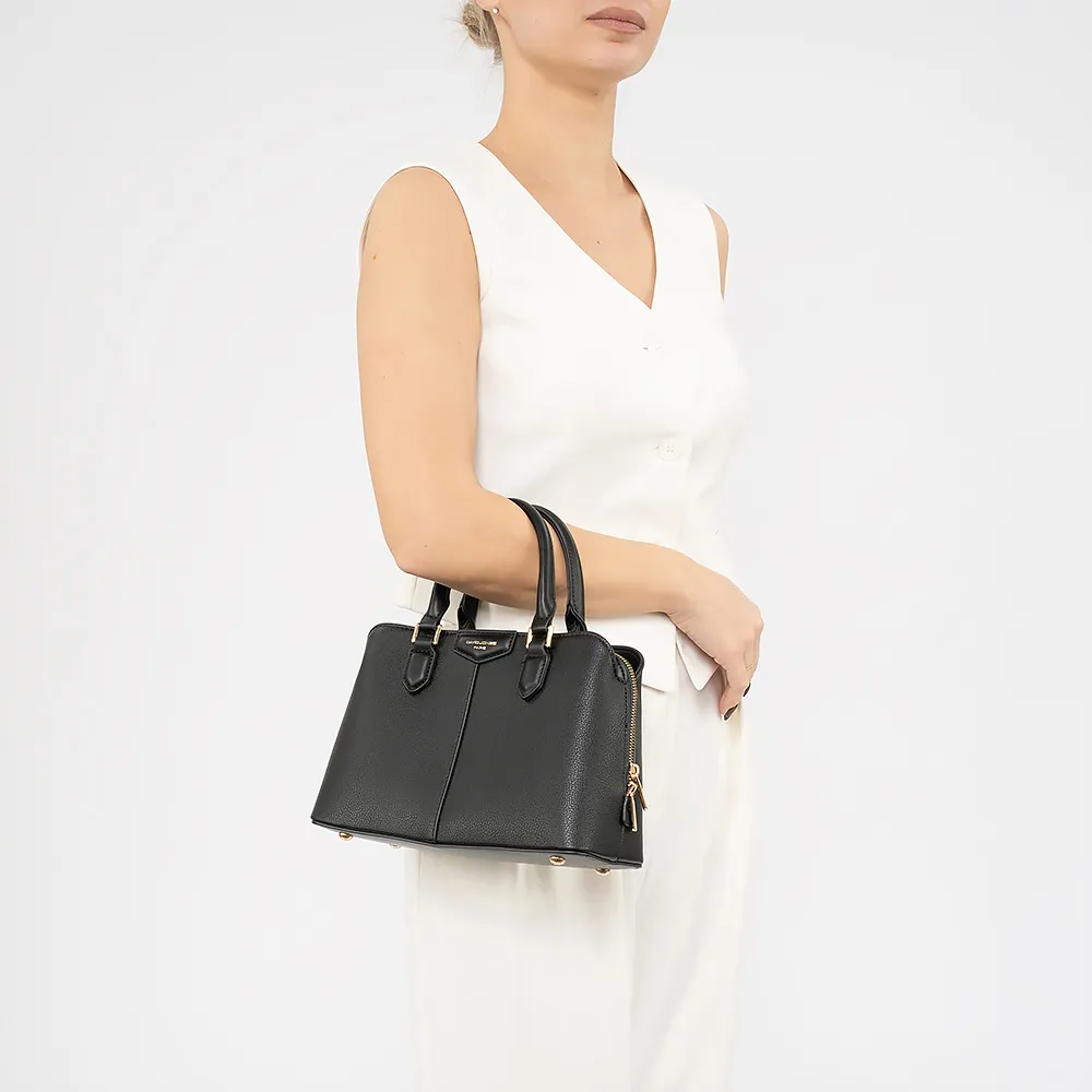 Сумка от торговой марки David Jones из искусственной кожи черного цвета. Модель с двумя ручками и съемным регулируемым плечевым ремнем. Отделение на молнии. Внутри: фирменная подкладка, карман на молнии и накладной карман. Спереди и сзади карман на магнитной кнопке. Дно оснащено металлическими ножками для защиты от износа.