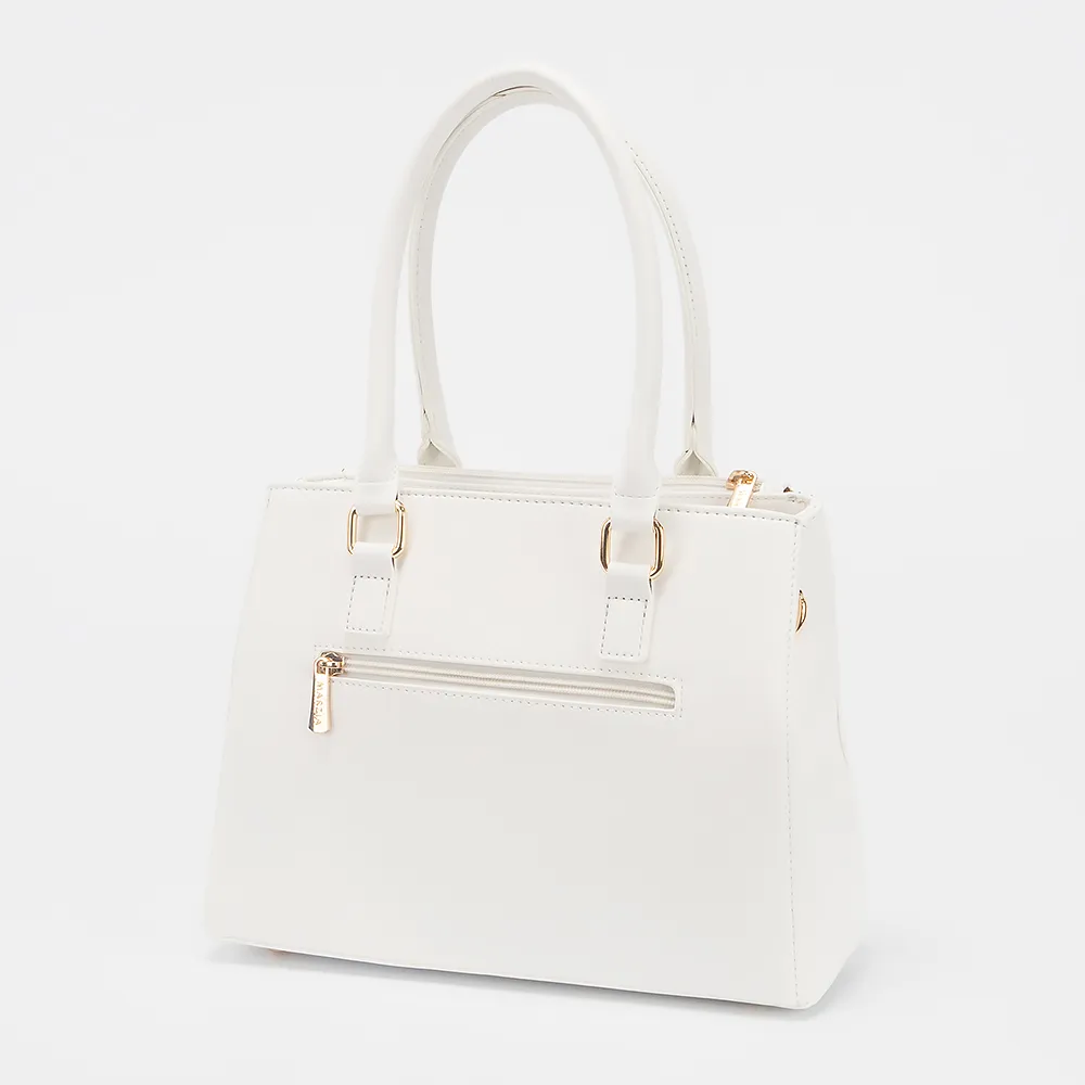 Сумка от торговой марки Marzia из искусственной кожи белого цвета. Модель с двумя ручками и съемным регулируемым плечевым ремнем. Закрывается молнией. Внутри: два отделения с фирменной подкладкой, карман на молнии, накладной карман. На задней стороне - карман на молнии. Дно оснащено металлическими ножками для защиты от износа.