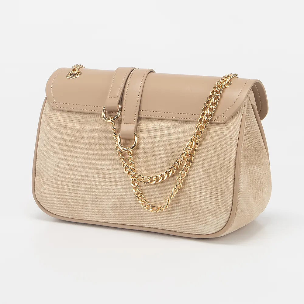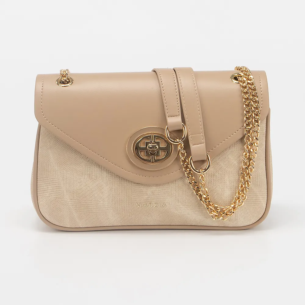 Сумка от торговой марки Marzia из искусственной кожи бежевого цвета. Модель с двумя ручками-цепочками. Закрывается клапаном на поворотном замке. В отделении: текстильная подкладка, карман на молнии, накладной карман, средник на молнии.