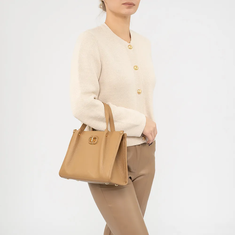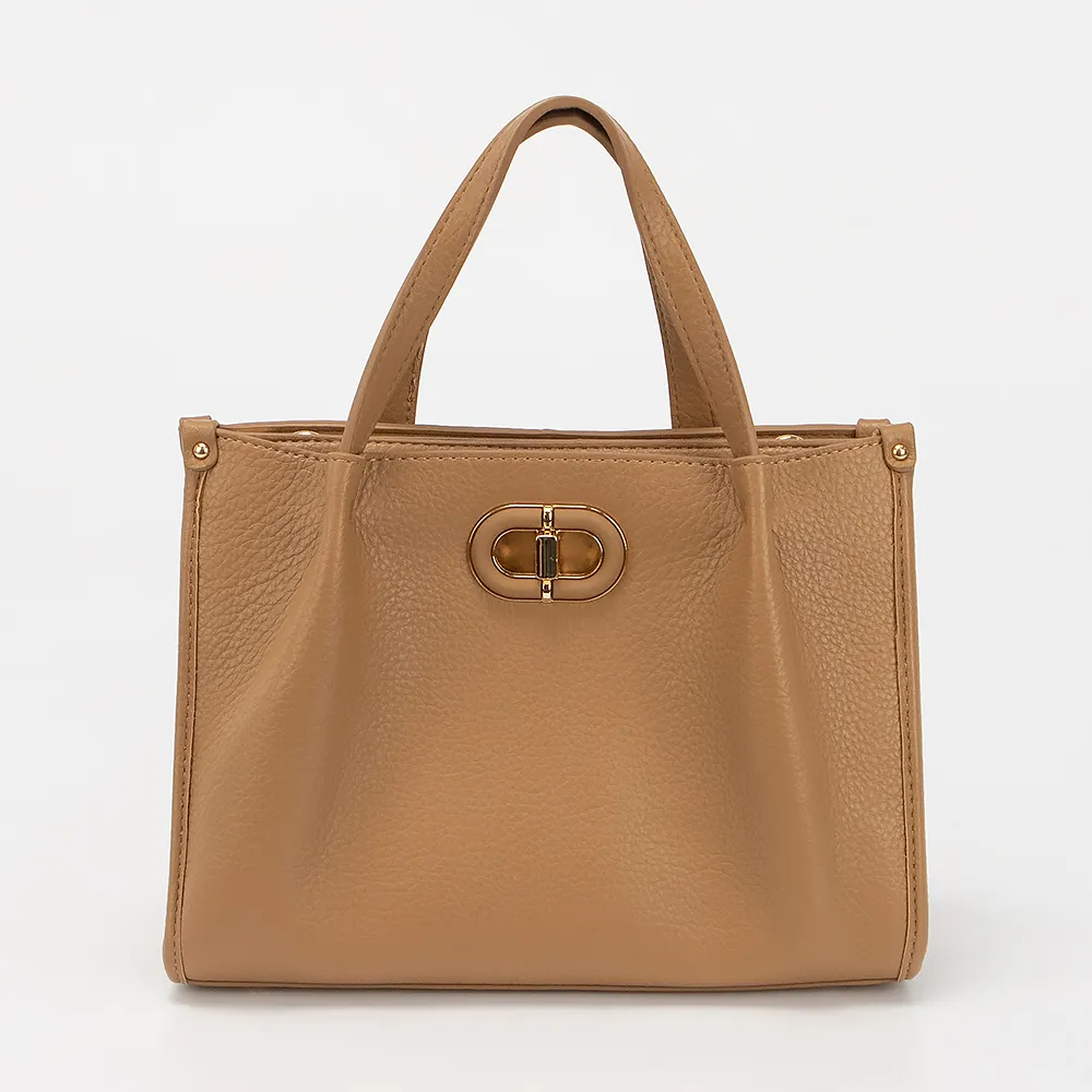Сумка от торговой марки Passo Avanti из искусственной кожи коричневого цвета. Модель с двумя ручками и съемным регулируемым плечевым ремнем. Основное отделение на молнии. Внутри: текстильная подкладка, карман на молнии, накладной карман. Предусмотрено дополнителоьное отделение на поворотном замке. Дно оснащено металлическими ножками для защиты от износа.