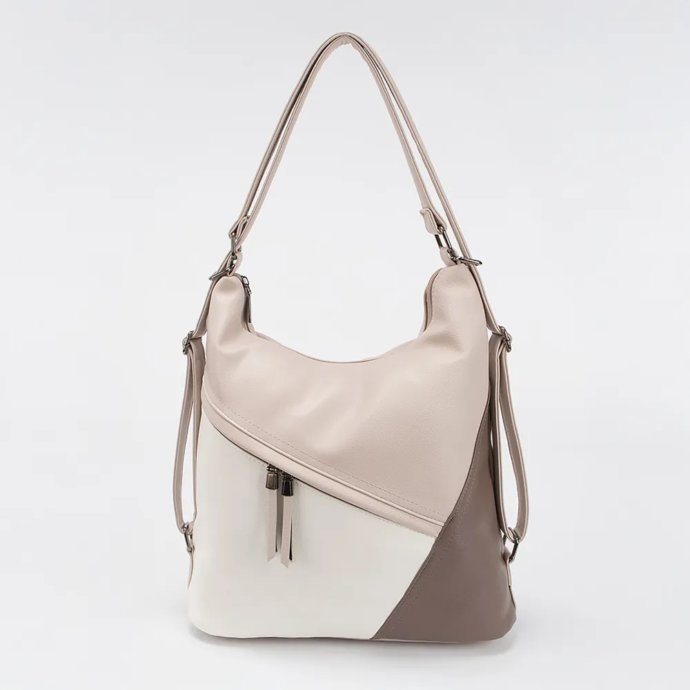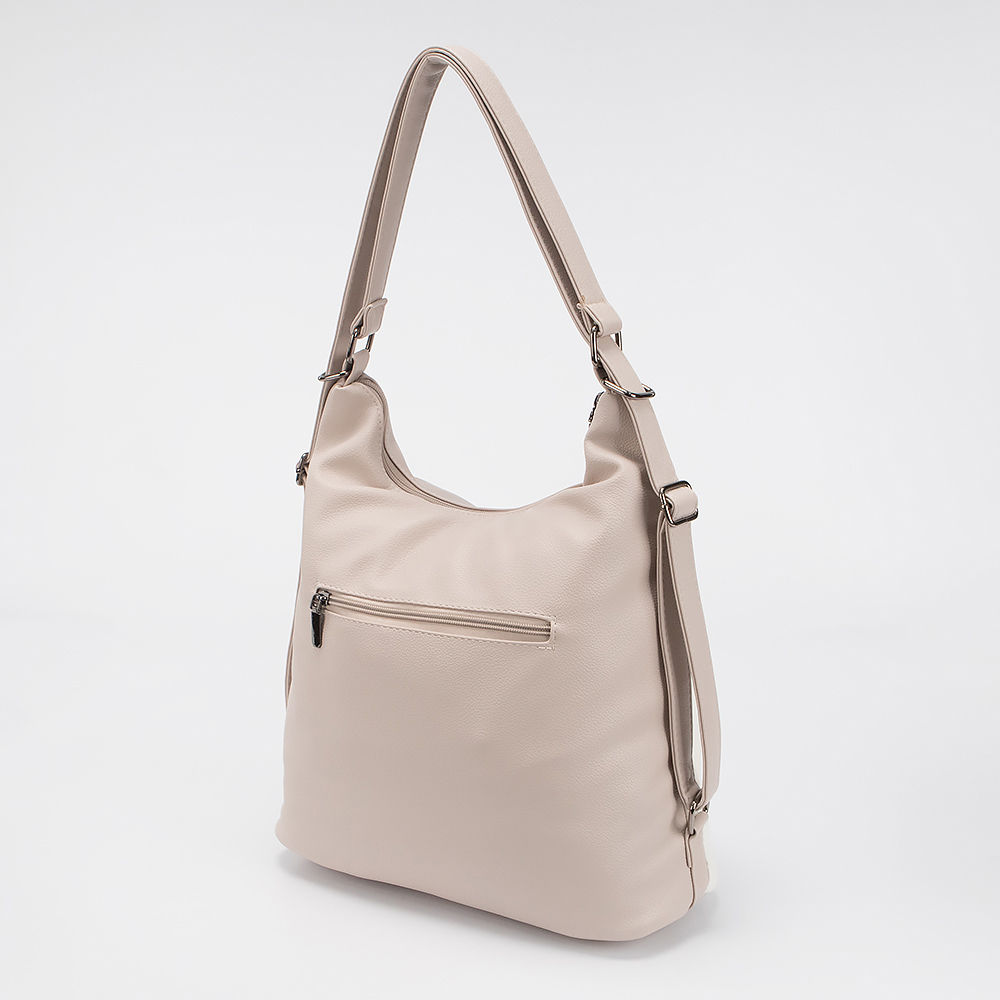 Сумка-рюкзак от торговой марки Passo Avanti из искусственной кожи. Лицевая сторона декорирована вставками. Модель с двумя удлиненными ручками, которые стягиваются в плечевые лямки. Отделение на молнии. Внутри: текстильная подкладка, средник и карман на молнии, два накладных кармана. На лицевой стороне - карман на молнии. На задней стороне - карман на молнии.