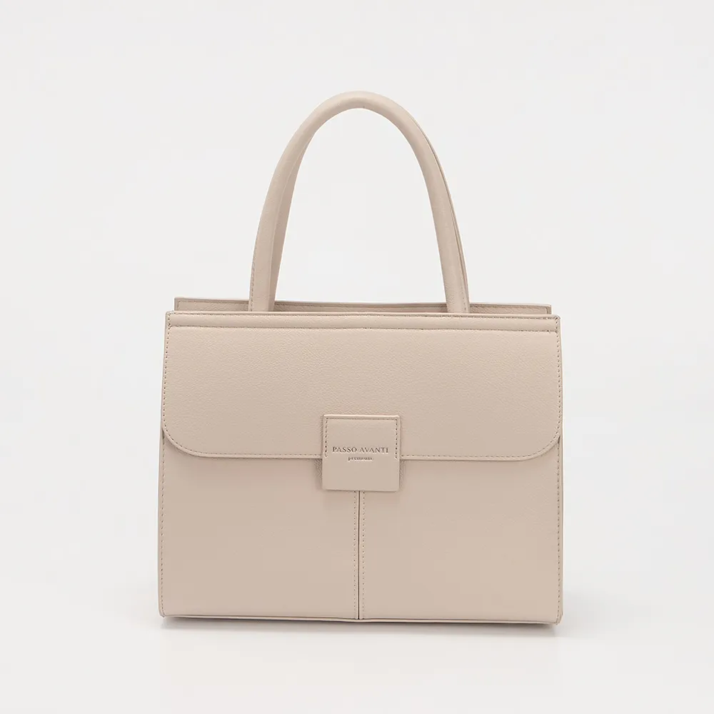 Сумка от торговой марки Passo Avanti из искусственной кожи бежевого цвета. Модель с двумя длинными ручками и съемным регулируемым плечевым ремнем. Отделение на молнии. Внутри текстильная подкладка, карман и средник на молнии, накладной карман. Сзади - карман на молнии.