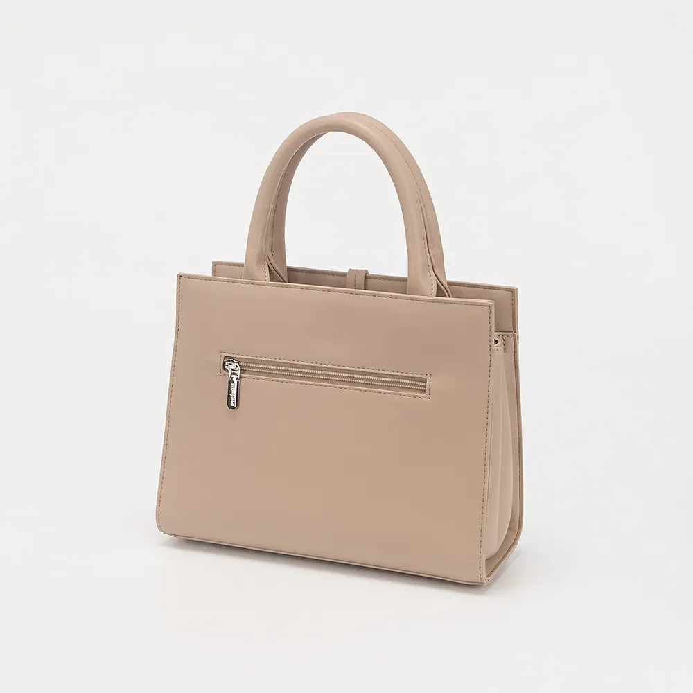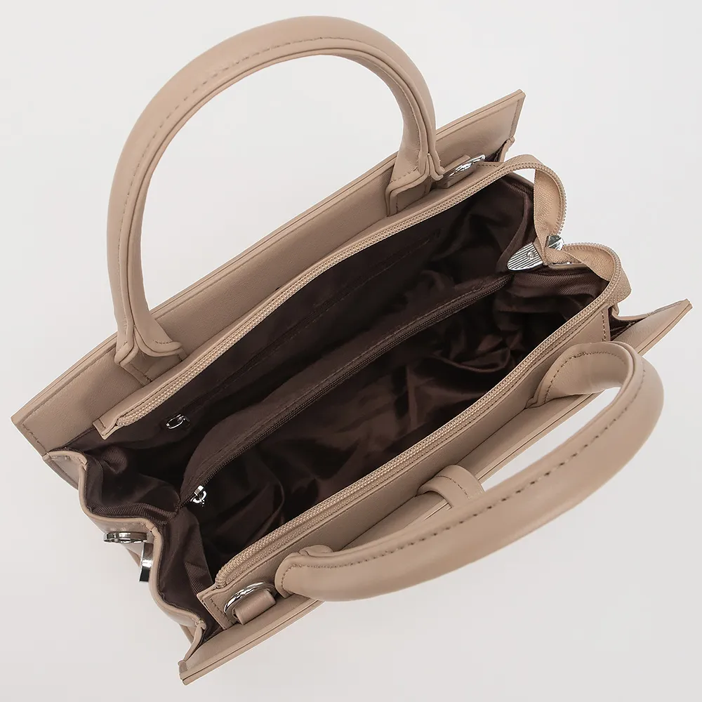 Сумка от торговой марки Passo Avanti из искусственной кожи бежевого цвета. Модель с двумя короткими ручками и съемным регулируемым плечевым ремнем. Отделение на молнии. Внутри текстильная подкладка, карман и средник на молнии, накладной карман. С лицевой стороны накладной карман с хлястиком на поворотном замке. Боковые вставки фиксируются на магнитные кнопки. Дно оснащено металлическими ножками для защиты от износа.