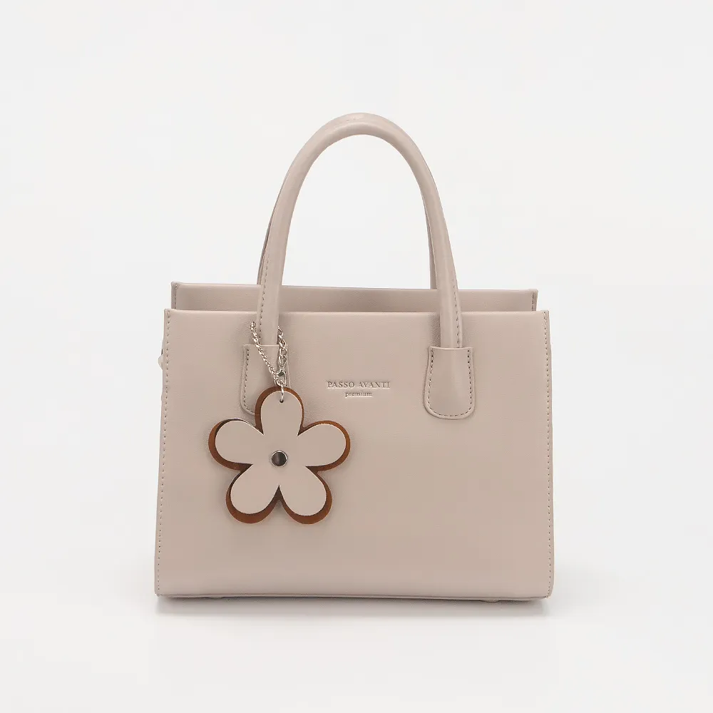 Сумка от торговой марки Passo Avanti из искусственной кожи кофейного цвета. Модель с двумя короткими ручками и съемным регулируемым плечевым ремнем. Декорирована подвеской в виде цветка из искусственной кожи. Отделение на молнии. Внутри три отдела, текстильная подкладка, карман на молнии, накладной карман. Дно оснащено нашивками для защиты от износа.