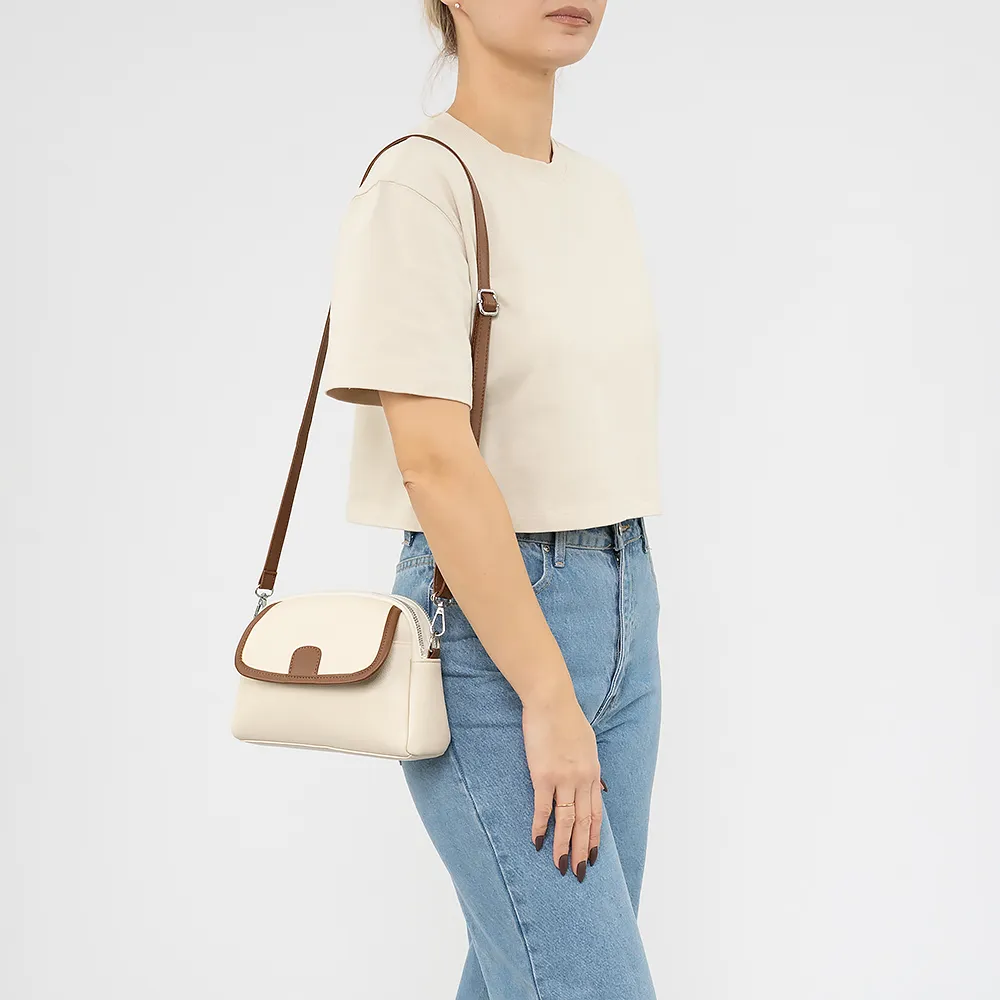Сумка от торговой марки Passo Avanti из искусственной кожи бежевого цвета с коричневыми элементами. Модель со съемным регулируемым плечевым ремнем. Два отделения на молнии, с текстильной подкладкой. В заднем отделении - карман на молнии. На лицевой стороне - накладной карман с клапаном на магнитной кнопке.