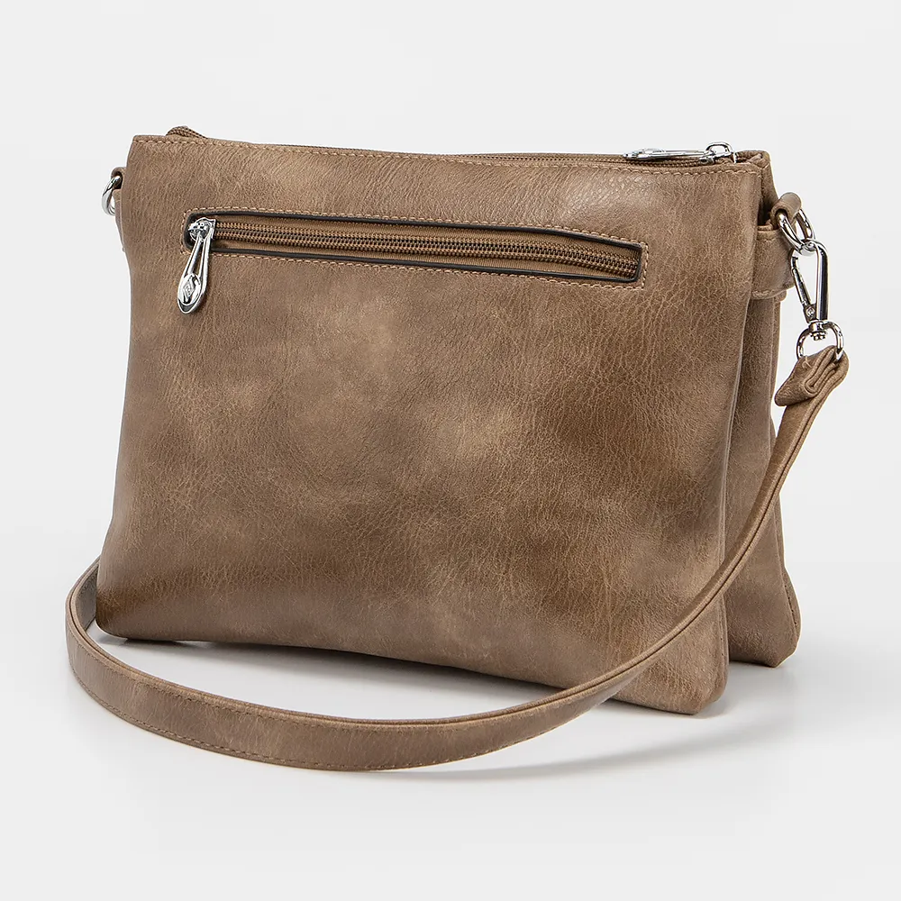 Сумка от торговой марки Passo Avanti из искусственной кожи кофейного цвета. Модель со съемным регулируемым плечевым ремнем. Закрывается молнией. Внутри: текстильная подкладка, три отсека, в одном из них - карман на молнии, в другом - накладной карман. На лицевой и задней сторонах - карман на молнии.