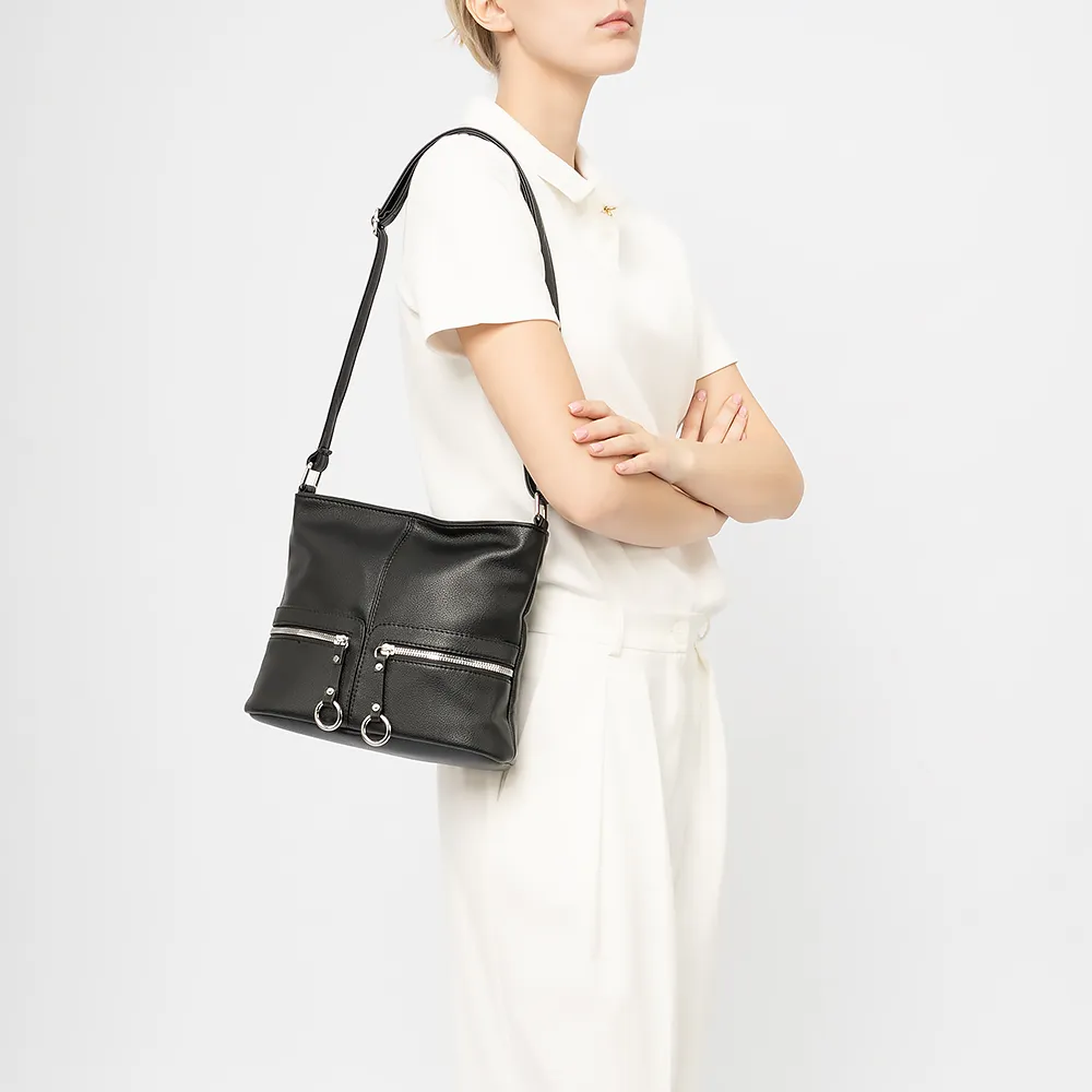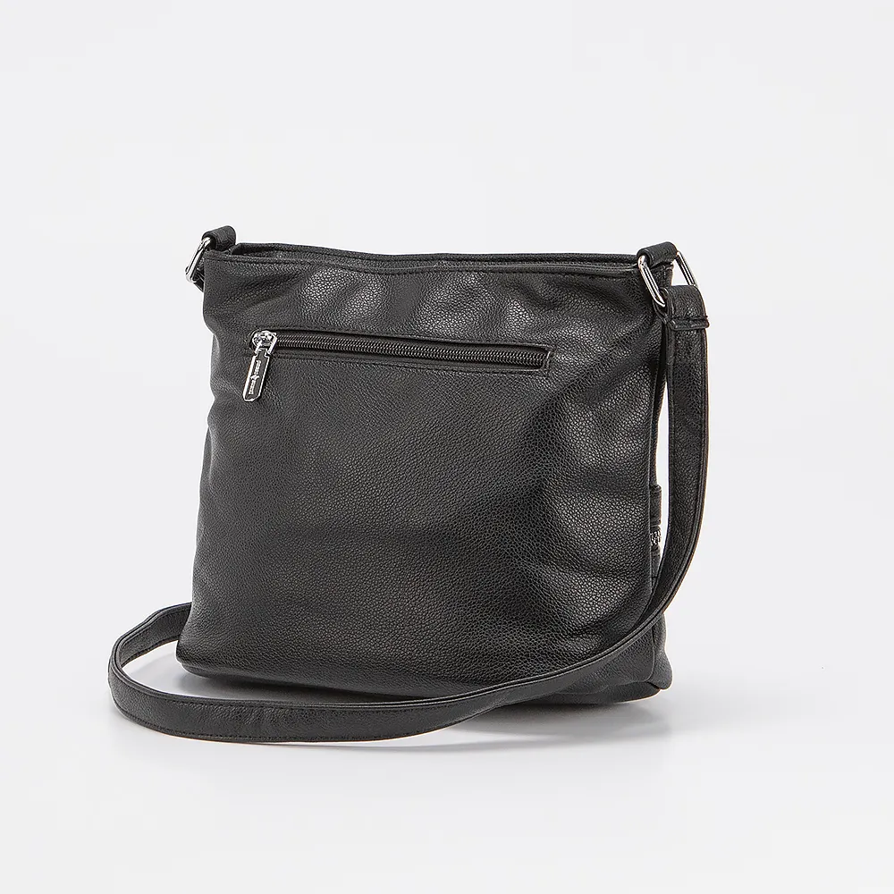 Сумка от торговой марки Passo Avanti из искусственной кожи черного цвета. Модель несъемным регулируемым плечевым ремнем. Отделение на молнии. Внутри: текстильная подкладка, карман на молнии, накладной карман. На лицевой стороне - два кармана на молнии с оригинальными пуллерами. На задней стороне - карман на молнии.