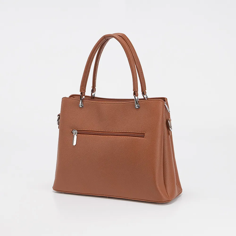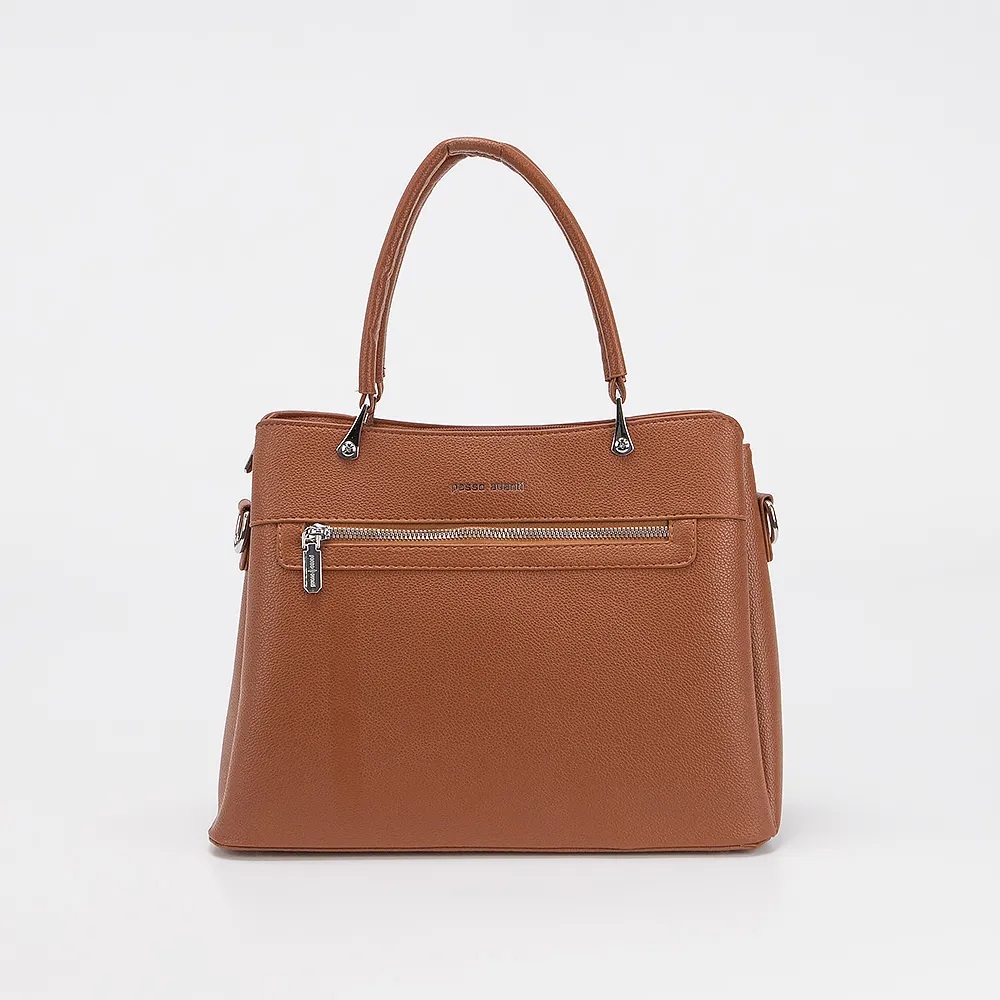 Сумка от торговой марки Passo Avanti из искусственной кожи коричневого цвета. Модель с двумя ручками и съемным регулируемым плечевым ремнем. Отделение на молнии. Внутри: три отсека, текстильная подкладка, карман на молнии, накладной карман. На лицевой и задней стороне - карман на молнии. Дно оснащено металиическими ножками для защиты от износа.