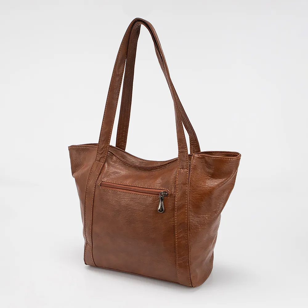 Сумка от торговой марки Passо Avanti из искусственной кожи коричневого цвета. Модель с двумя длинными ручками, декорированы узором в виде косички. Отделение на молнии. Внутри: текстильная подкладка, средник и карман на молнии, накладной карман. На задней стороне - карман на молнии.