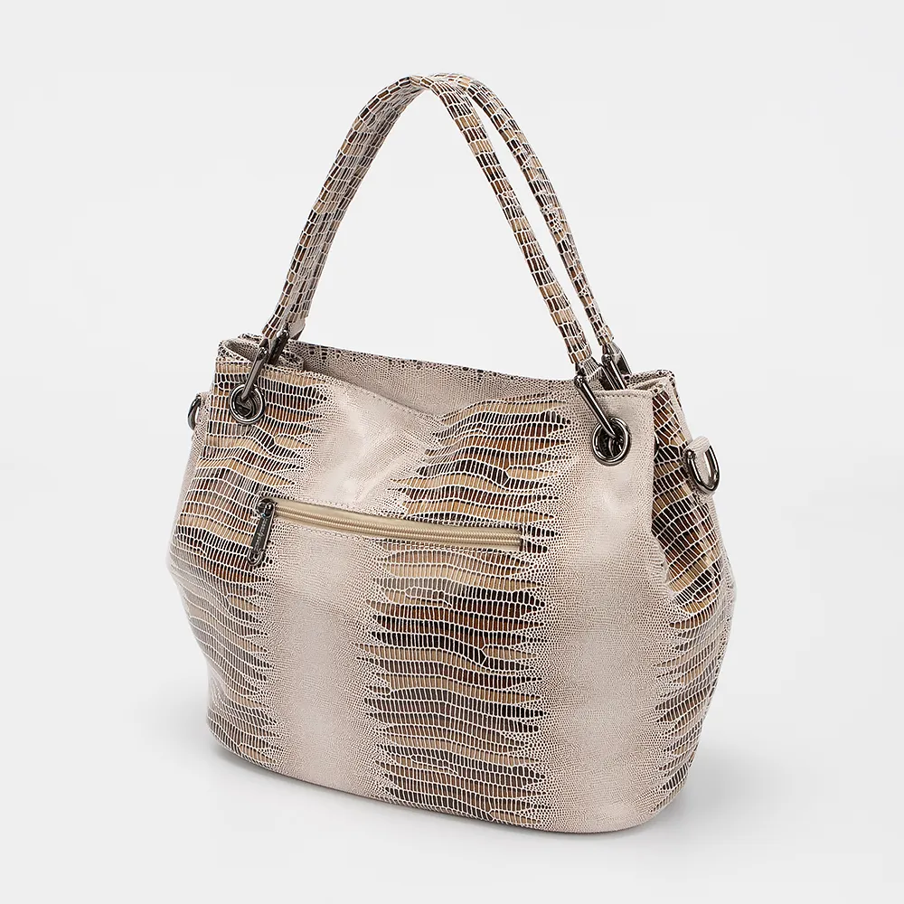 Сумка от торговой марки Passo Avanti из искусственной кожи кофейного цвета с лазерным тиснением под рептилию. Вместительная модель с двумя ручками и съемным регулируемым плечевым ремнем. Отделение на молнии. Внутри: фирменная текстильная подкладка, карман на молнии, образующий накладной карман, два накладных кармана. На задней стороне - карман на молнии.