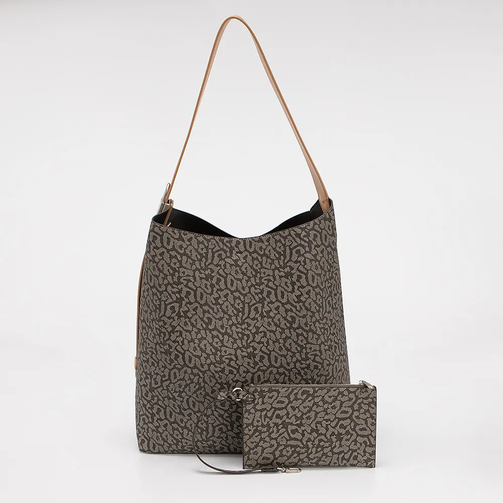 Сумка от торговой марки Marzia из искусственной кожи кофейного цвета с принтом под леопарда. Модель с длинной регулируемой ручкой. Отделение закрывается карабином, без подкладки. Дно оснащено металлическими ножками для защиты от износа. В комплект входит кошелек на молнии.