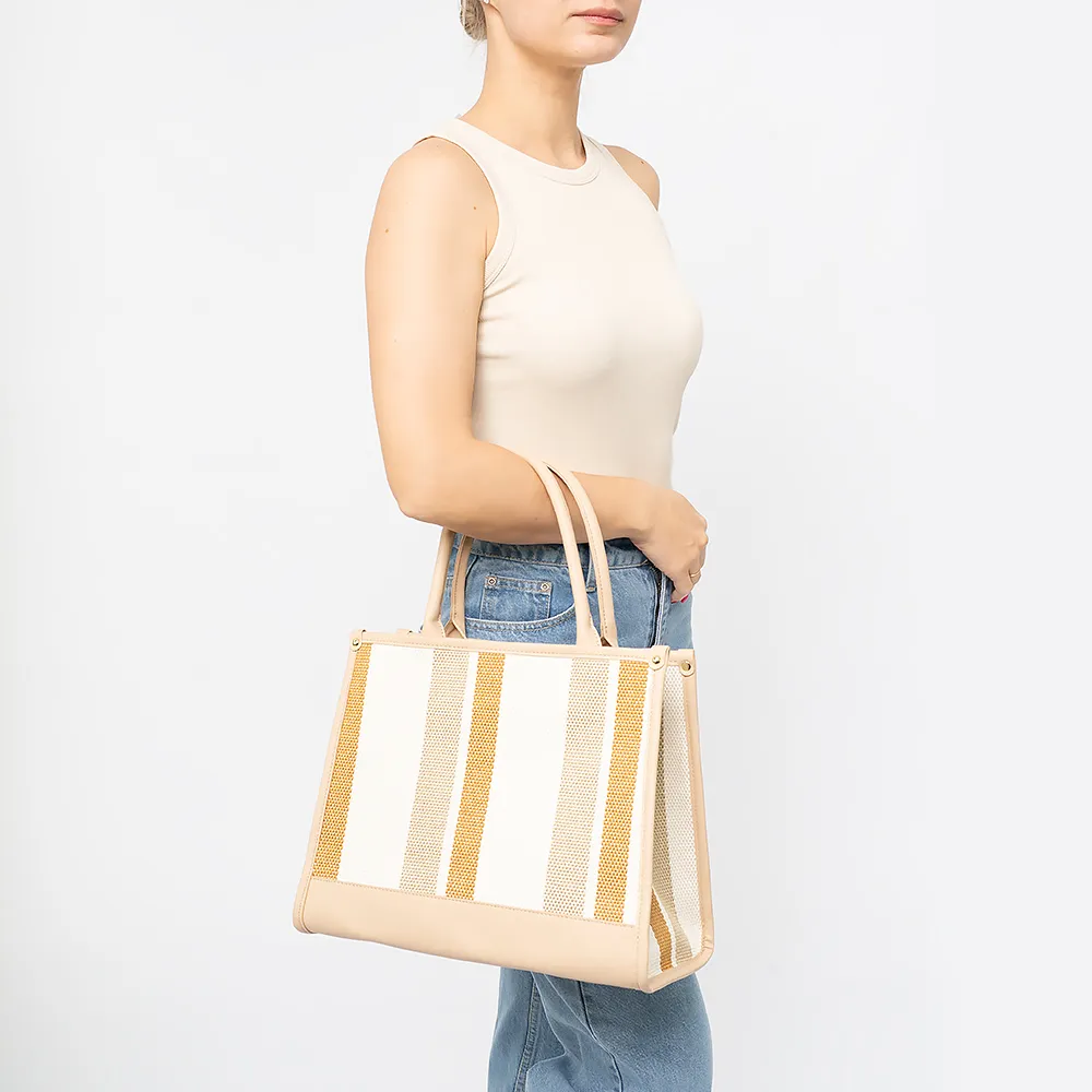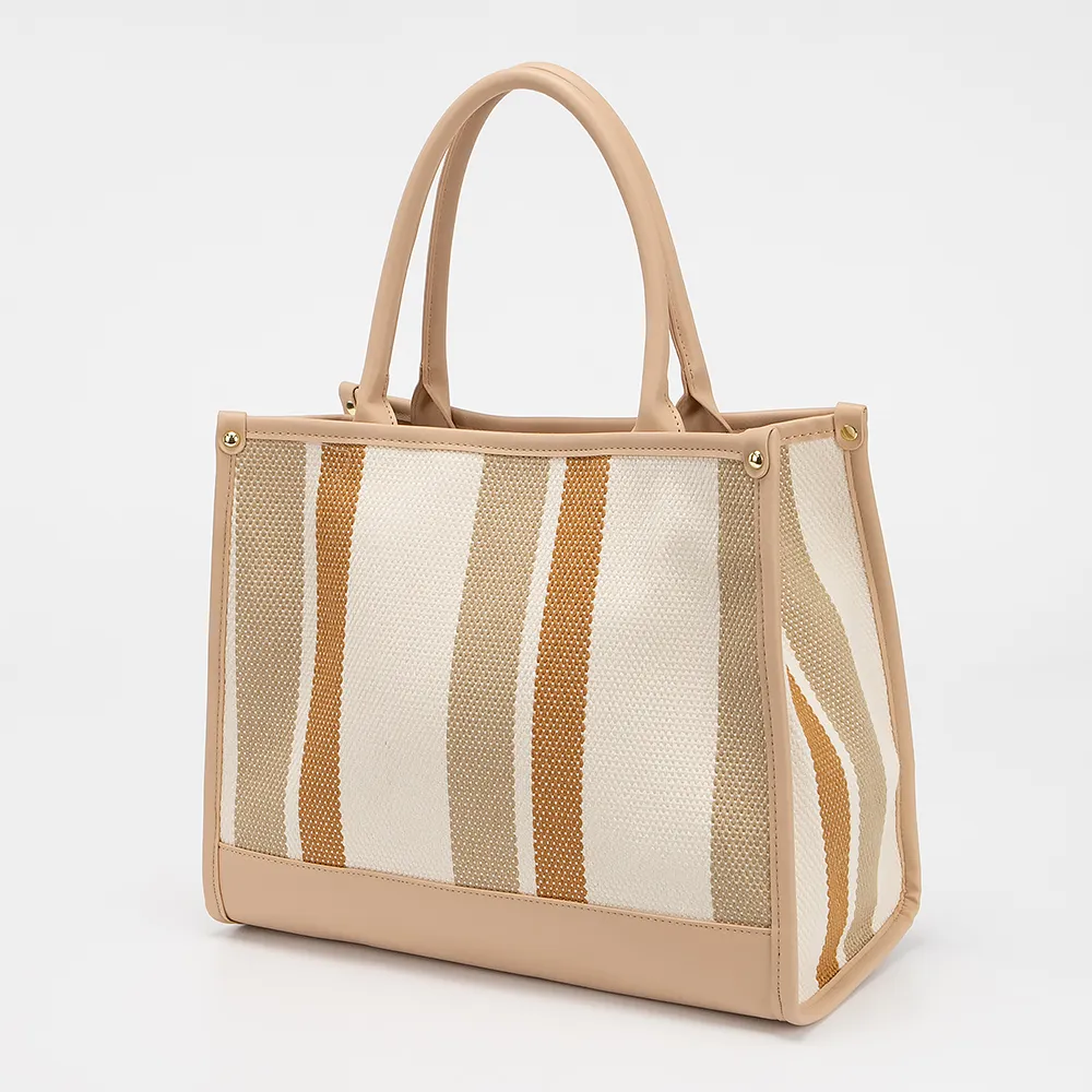 Сумка от торговой марки Passo Avanti выполнена из текстильного материала и искусственной кожи бежевого цвета с полосками. Модель с двумя ручками и съемным регулируемым широким плечевым ремнем. Отделение на молнии. Внутри: текстильная подкладка, карман на молнии, накладной карман.
