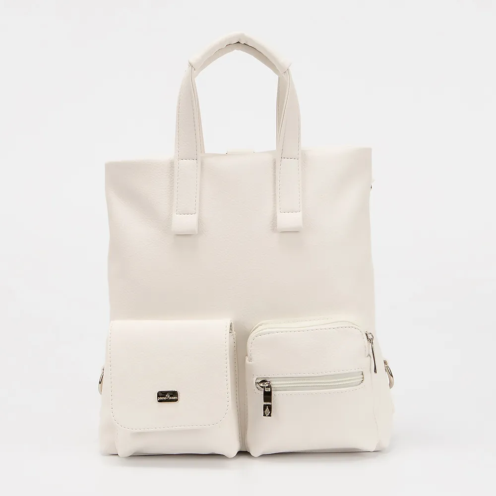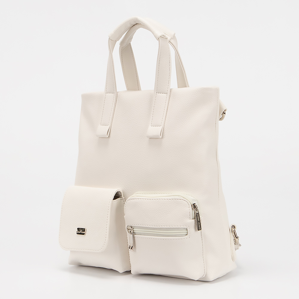 Сумка-рюкзак от торговой марки Passo Avanti из искусственной кожи белого цвета. Модель с двумя короткими ручками, и плечевыми лямками, которые трансформируются в плечевой ремень. Отделение на молнии. Внутри: текстильная подкладка, карман на молнии, накладной карман. На лицевой стороне - два кармана на молнии и карман с клапаном на магнитной кнопке. На задней стороне - вертикальный карман на молнии.