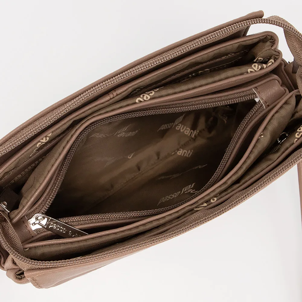 Сумка-клатч от торговой марки Passo Avanti из искусственной кожи кофейного цвета. Модель со съемным регулируемым плечевым ремнем. Закрывается молнией. Внутри: три отделения с текстильной подкладкой, среднее отделение на молнии, в заднем отсеке - два накладных кармана, в переднем - карман на молнии. На задней стороне - карман на молнии.