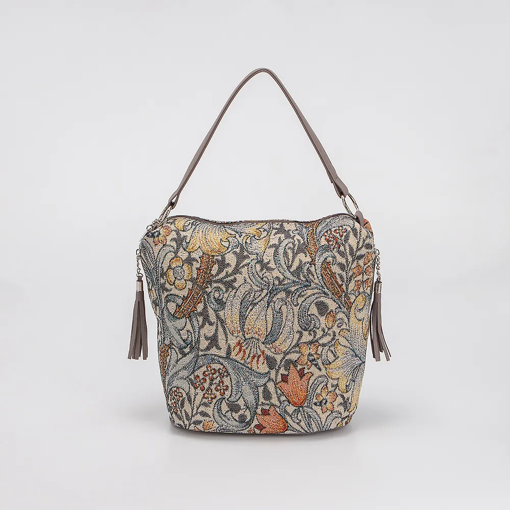 Сумка от торговой марки Passo Avanti из текстильного материала с элементами искусственной кожи с изображением цветов. Модель с длинной ручкой и съемным плечевым ремнем. Декорирована подвесками-кисточками. Отделение на молнии. Внутри: текстильная подкладка, карман и средник на молнии, накладной карман. На задней стороне - карман на молнии.