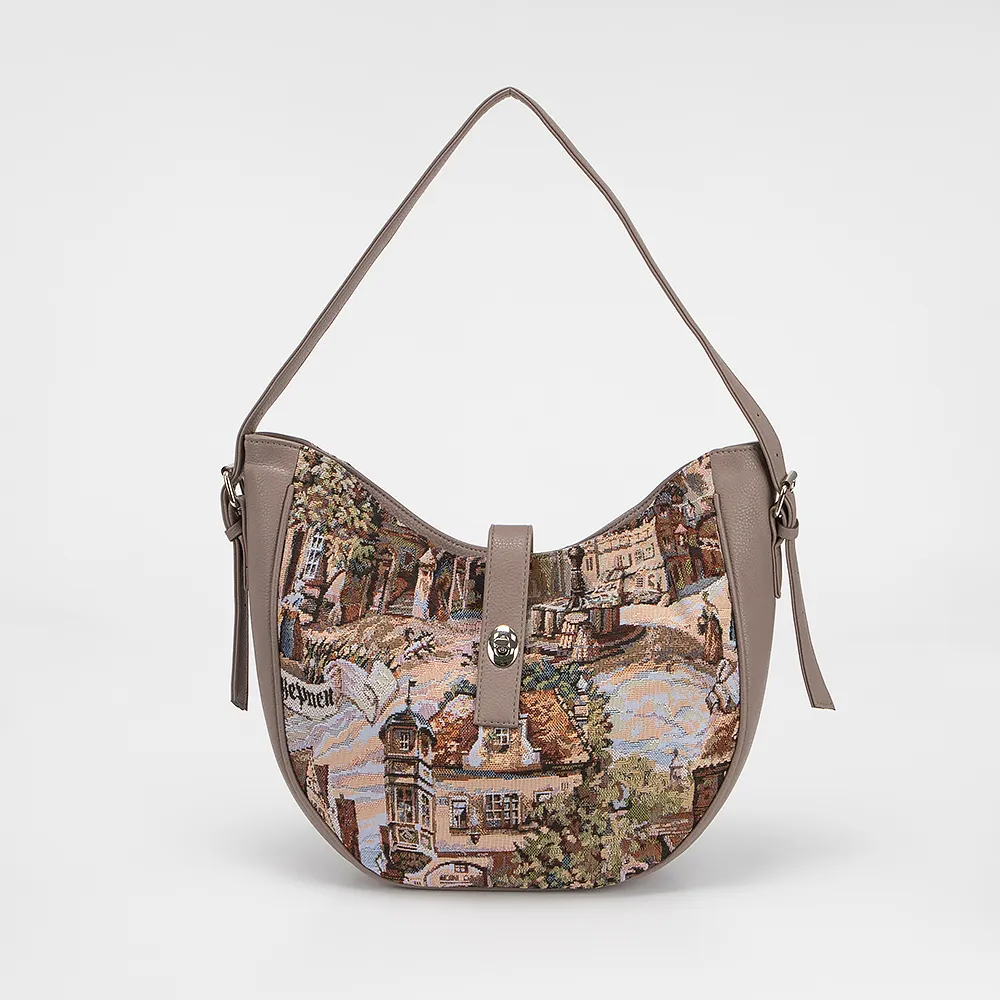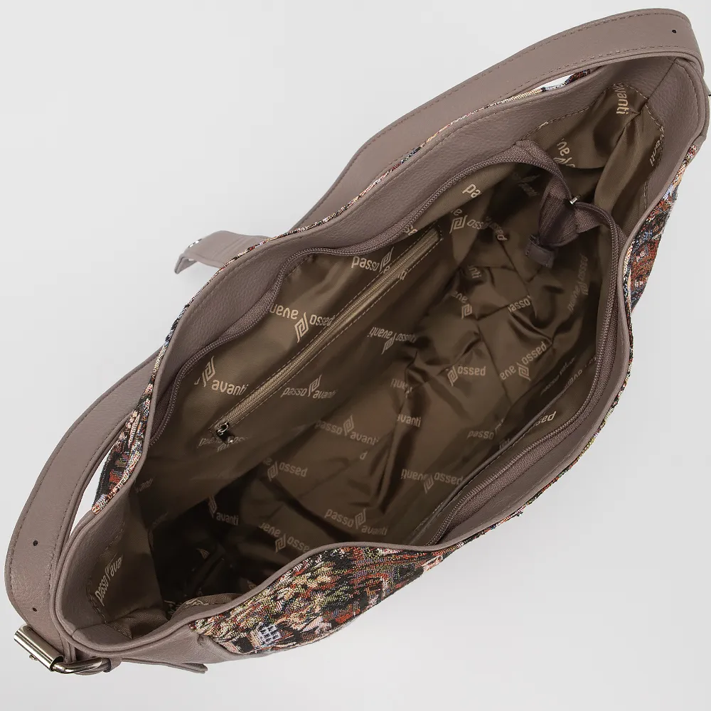 Сумка от торговой марки Passo Avanti из текстильного материала в сочетании с искусственной кожей кофейного цвета. Модель с удлиненной ручкой. Отделение на молнии, дополнительно закрывается хлястиком на повортоном замке. Внутри: текстильная подкладка, накладной карман, карман на молнии. На задней стороне - карман на молнии.