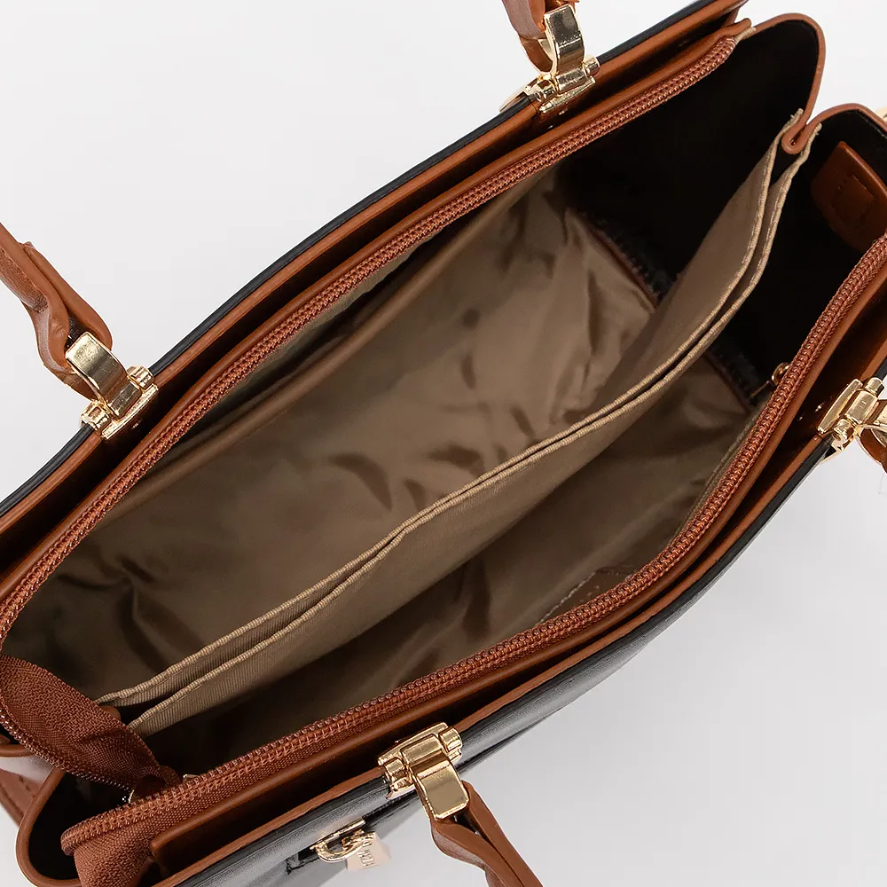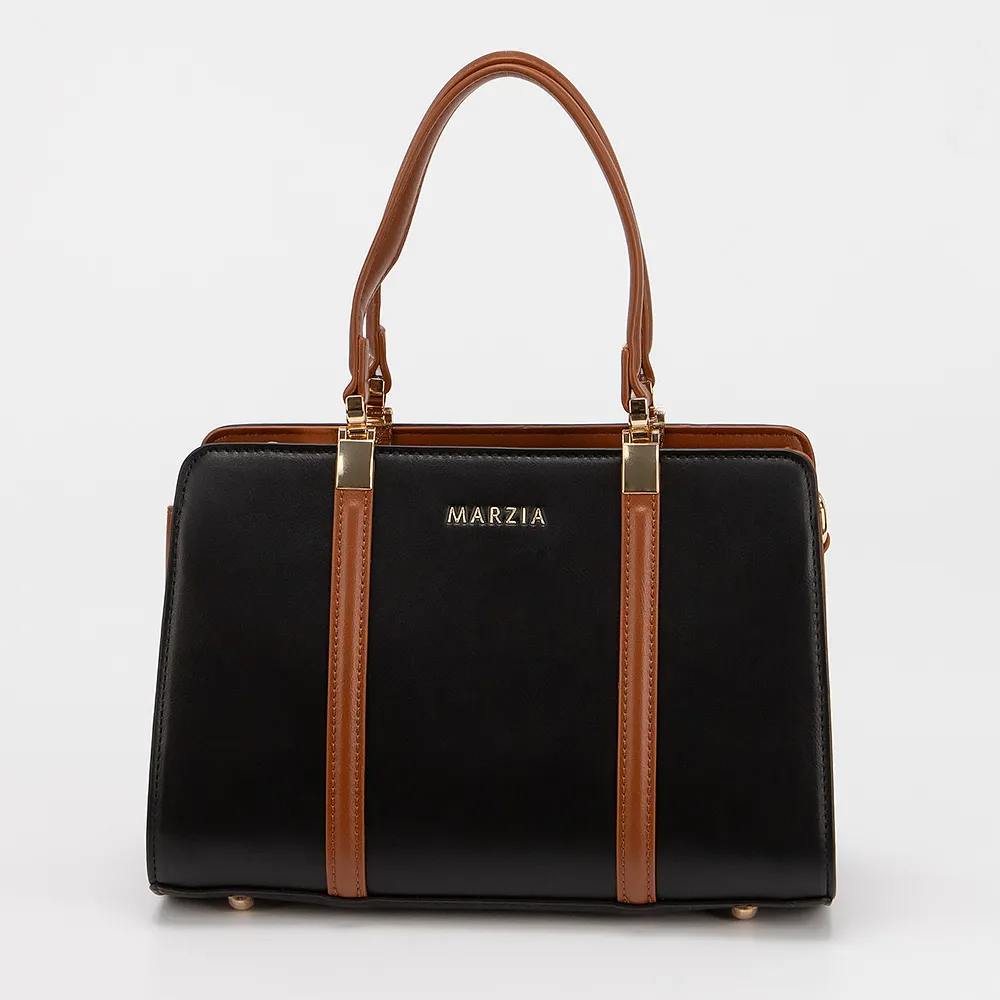 Сумка от торговой марки Marzia выполнена из искусственной кожи черного цвета. Модель с двумя ручками и съемным регулируемым плечевым ремнем. Отделение на молнии. Внутри: текстильная подкладка, средник без застежки, карман на молнии, накладной карман. На задней стороне - карман на молнии. Дно оснащено металлическими ножками для защиты от износа.
