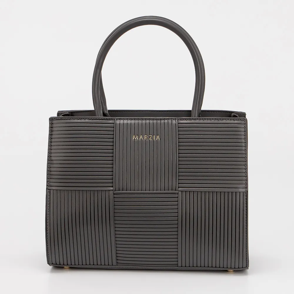 Сумка от торговой марки Marzia выполнена из искусственной кожи серого цвета. Модель с двумя ручками и съемным регулируемым плечевым ремнем. Декорирована объемным плетением. Отделение на молнии. Внутри: текстильная подкладка, средник без застежки, карман на молнии, накладной карман. На задней стороне - карман на молнии. Дно оснащено металлическими ножками для защиты от износа.