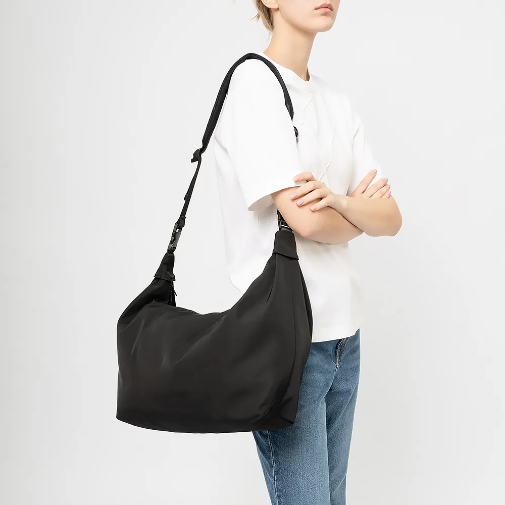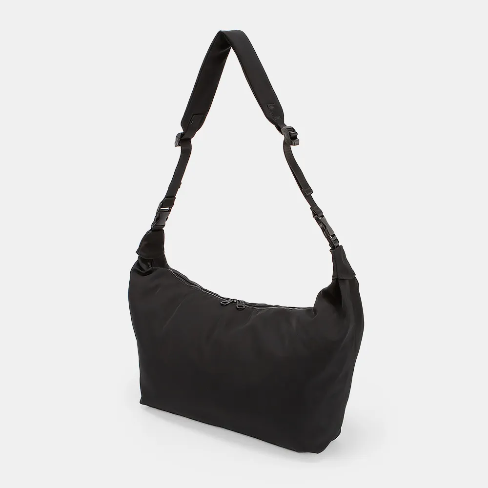 Сумка от торговой марки Ecotope из текстильного материала черного цвета. Модель с длинным регулируемым съемным плечевым ремнем. Отделение на молнии. Внутри: текстильная подкладка, карман на молнии, накладной карман.