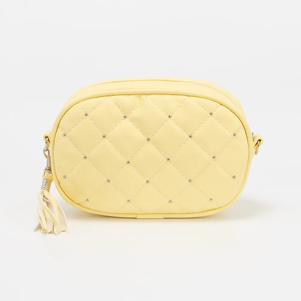 Сумка от торговой марки Passo Avanti из искусственной кожи желтого цвета с ромбовидной стежкой. Модель с длинным регулируемым плечевым ремнем. Декорирована металлическими бусинами и кисточкой из искусственной кожи. Отделение на молнии. Внутри: текстильная подкладка, накладной карман, карман на молнии.