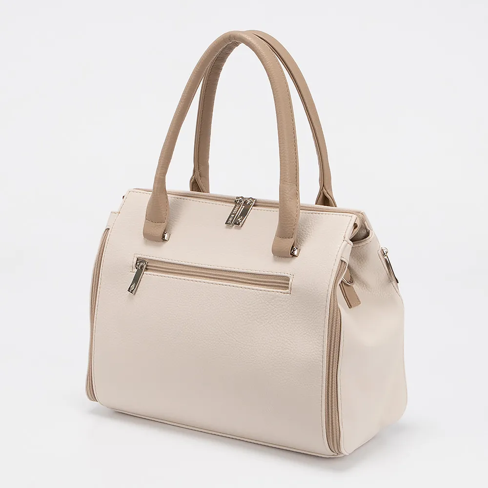 Сумка от торговой марки Passo Avanti выполнена из искусственной кожи бежевого цвета. Модель с двумя ручками и съемным регулируемым плечевым ремнем. Декорирована вертикальными молниями по бокам. Отделение на молнии. Внутри: текстильная подкладка, карман на молнии, накладной карман. На задней стороне - карман на молнии. Дно оснащено металлическими ножками для защиты от износа.