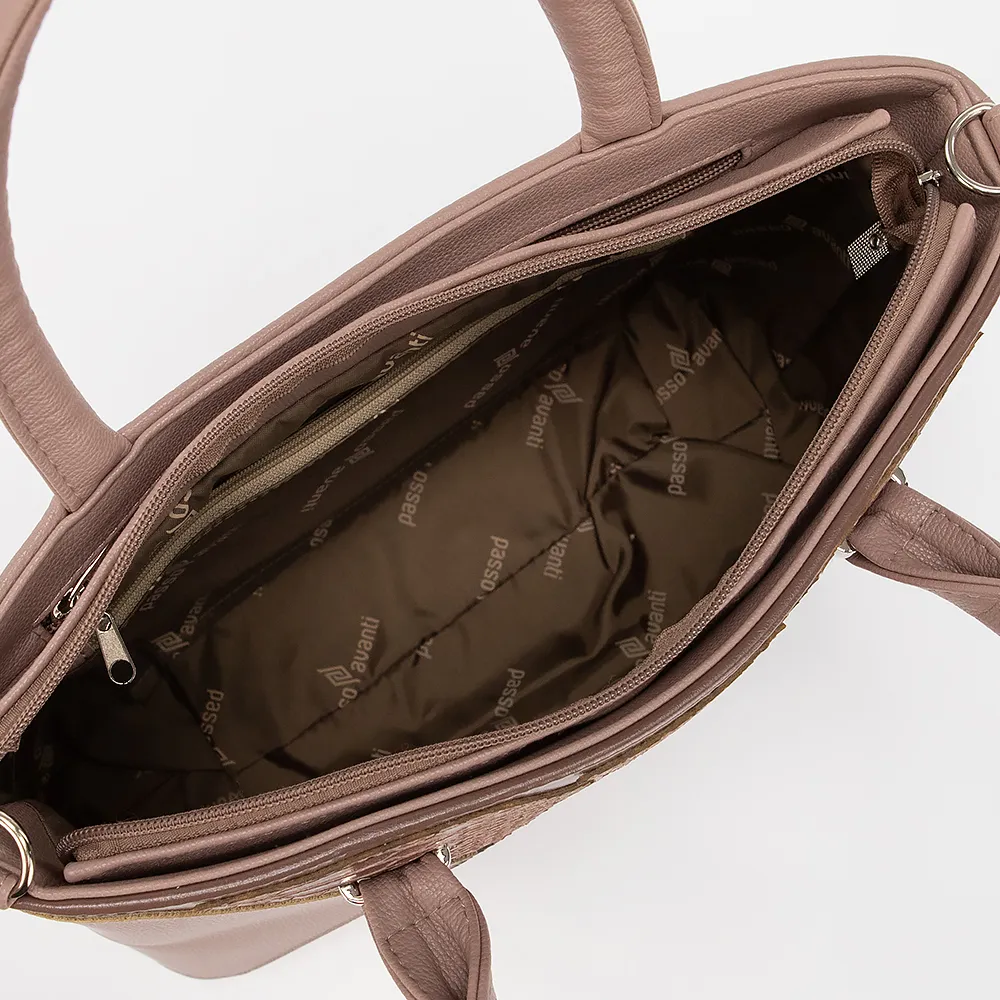 Сумка от торговой марки Passo Avanti выполнена из искусственной кожи кофейного цвета с вставками с тиснением под рептилию. Модель двумя ручками и съемным регулируемым плечевым ремнем. Отделение на молнии. Внутри: текстильная подкладка, карман на молнии, накладной карман. Рядом с основным отделением имеется дополнительный карман на молнии. На задней стороне - карман на молнии. Дно оснащено металлическими ножками для защиты от износа.