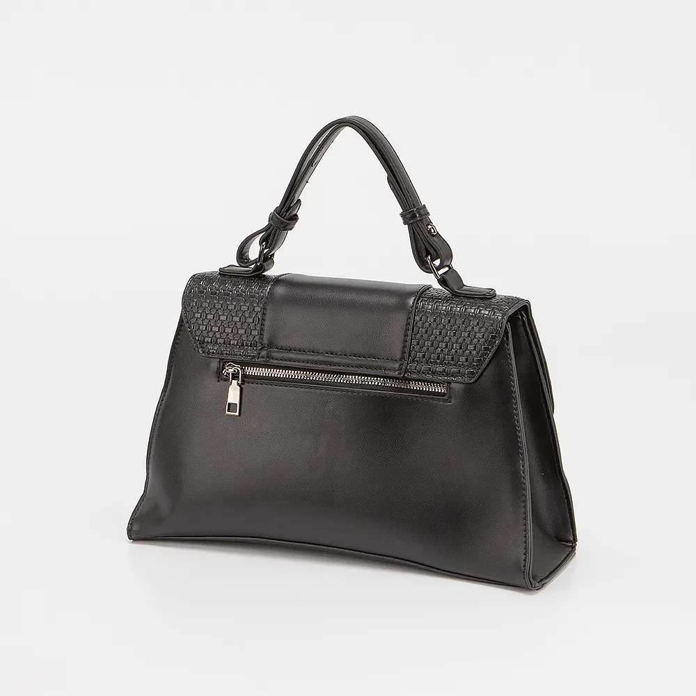 Сумка от торговой марки Marzia выполнена из искусственной кожи черного цвета и вставками с тиснением под плетение. Модель с ручкой и съемным регулируемым плечевым ремнем. Клапан на поворотном замке закрывает отделение на молнии. Внутри: текстильная подкладка, карман и средник на молнии, накладной карман.