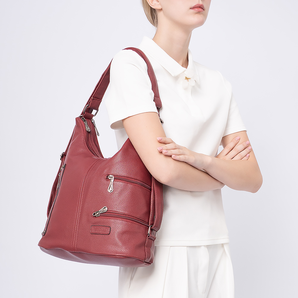 Сумка-рюкзак от торговой марки Passo Avanti из искусственной кожи бордового цвета. Модель с двумя ручками, которые стягиваются в плечевые лямки. Два отделения на молнии. Внутри: текстильная подкладка, карман на молнии, накладной карман. На лицевой стороне - три кармана на молнии. На задней стороне - карман на молнии.