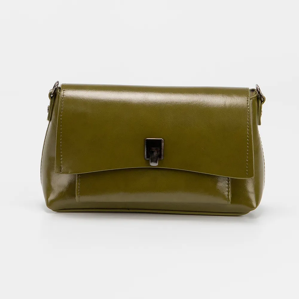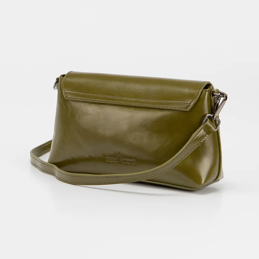 Сумка от торговой марки Passo Avanti из искусственной кожи цвета хаки. Модель со съемным регулируемым плечевым ремнем. Клапан на поворотном замке закрывает отделение на молнии и накладной карман. Внутри: текстильная подкладка, карман на молнии, накладной карман.