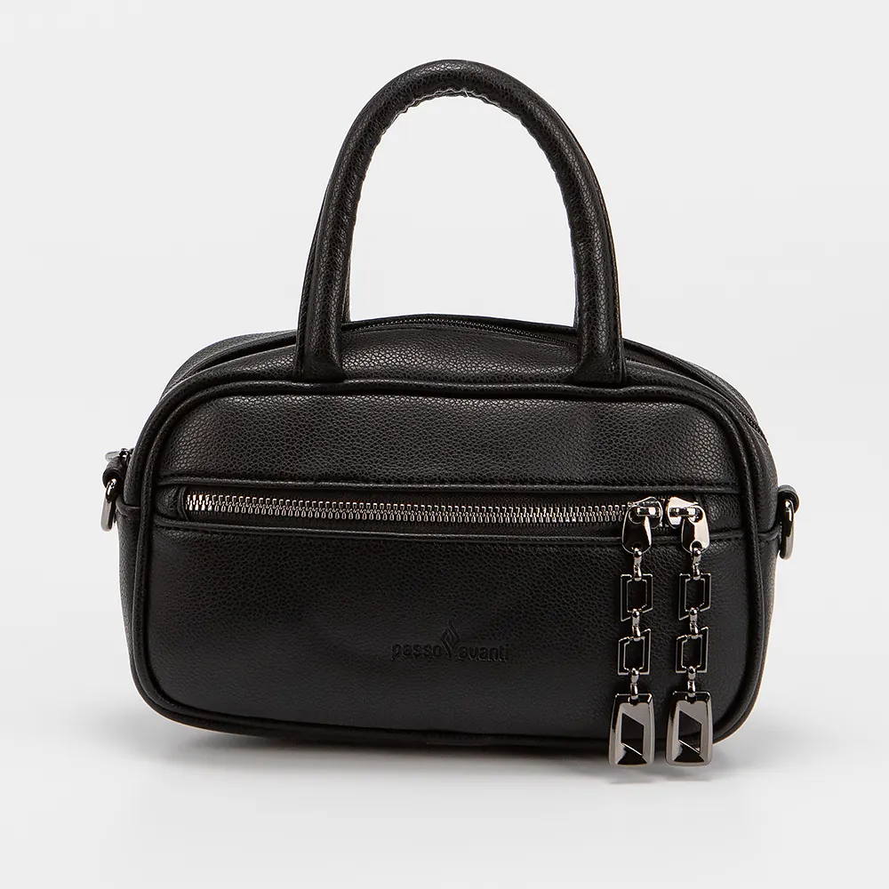 Сумка от торговой марки Passo Avanti выполнена из искусственной кожи черного цвета. Модель с двумя ручками и съемным регулируемым плечевым ремнем. Отделение на молнии. Внутри: текстильная подкладка, карман на молнии, накладной карман. На лицевой стороне карман на молнии с пуллерами-подвесками. На задней стороне - карман на молнии.