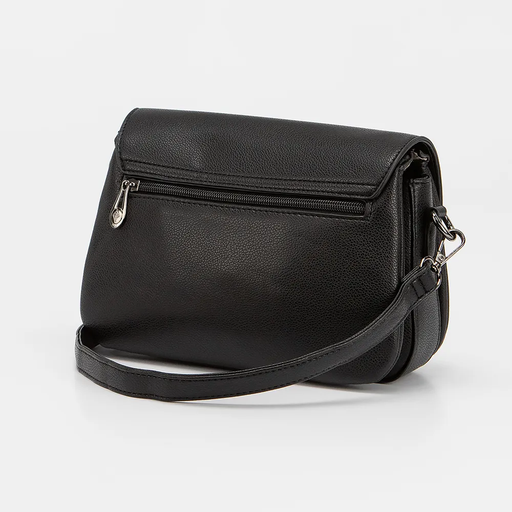 Сумка от торговой марки Passo Avanti выполнена из искусственной кожи черного цвета. Модель с длинным регулируемым плечевым ремнем. Клапан на магнитных кнопках закрывает отделение на молнии. Внутри: три отсека, средний - на молнии, текстильная подкладка, карман на молнии, накладной карман. На задней стороне - карман на молнии.