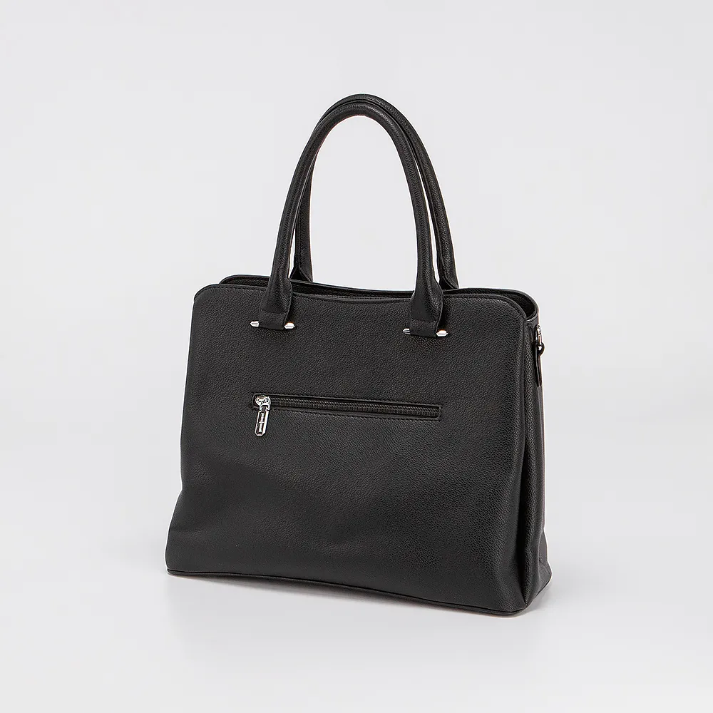 Сумка от торговой марки Passo Avanti выполнена из искусственной кожи черного цвета с контрастными вставками. Модель с двумя ручками и съемным регулируемым плечевым ремнем. Отделение на молнии. Внутри: три отсека, текстильная подкладка, карман на молнии, накладной карман. С задней стороны - карман на молнии. Дно оснащено металлическими ножками для защиты от износа.