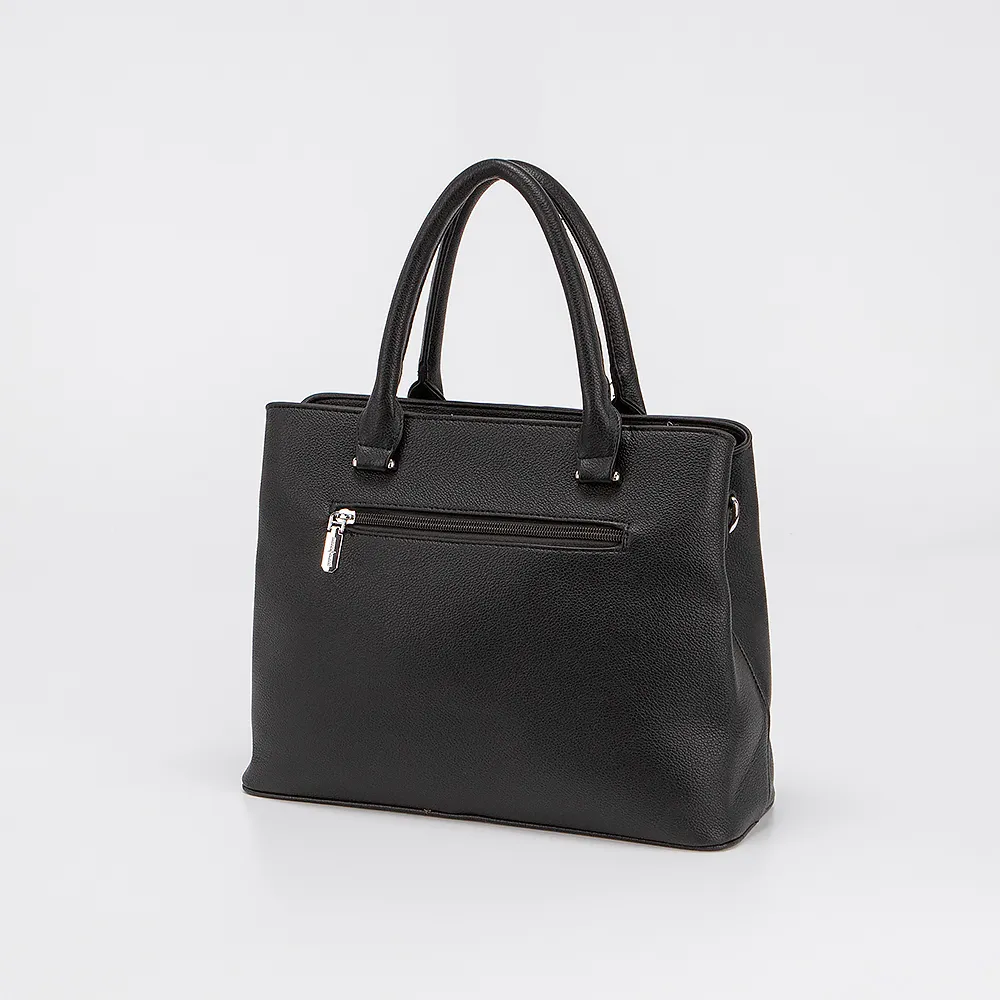 Сумка от торговой марки Passo Avanti выполнена из искусственной кожи черного цвета. Модель с двумя ручками и съемным регулируемым плечевым ремнем. Отделение на молнии. Внутри: текстильная подкладка, карман и средник на молнии, накладной карман. С лицевой и задней стороны - карман на молнии.