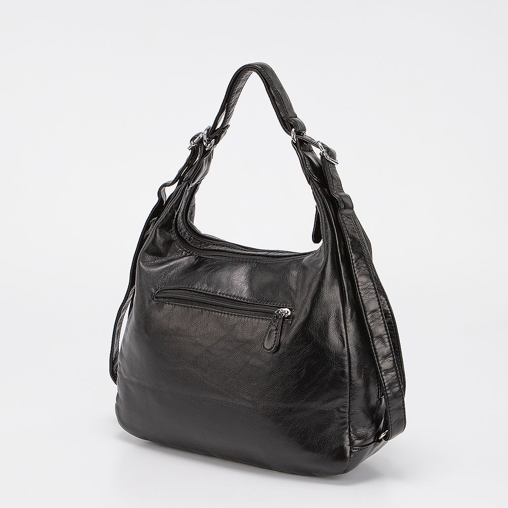 Сумка-рюкзак от торговой марки Passo Avanti выполнен из искусственной кожи черного цвета. Модель с удлиненной ручкой, которая стягивается в плечевые лямки. Два отделения на молнии. Внутри: текстильная подкладка. С лицевой стороны три кармана на молнии. По бокам - карманы на молнии.